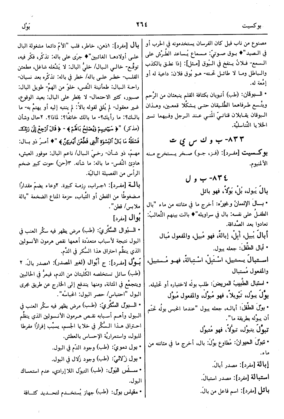• بالَ الإنسانُ وغيرُه: أخرج ما في مثانته من ماء "بال الطفلُ على نفسه: بال في سراويله" ° بالت بينهم الثَّعالبُ: تعادوا بعد الصَّداقة.