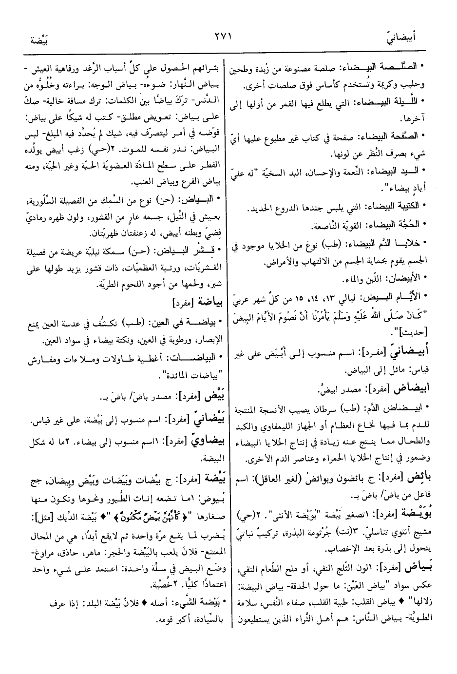 1 - لون الثّلج النقيّ، أو ملح الطّعام النقيّ، عكس سواد "بياض العَيْن: ما حول الحدقة- بياض البيضة: زلالها" ° بياض النَّاس: هم أهل الثَّراء الذين يستطيعون بثرائهم الحصول على كلِّ أسباب الرَّغد ورفاهية العيش- بياض القلب: طيبة القلب، صفاء النَّفس، سلامة الطويَّة- بياض النَّهار: ضوءُه- بياض الوجه: براءته وخُلُوُّه من الدَّنس- ترَكَ بياضًا بين الكلمات: ترك مسافة خالية- صكّ على بياض: تعويض مطلق- كتب له شيكًا على بياض: فوّضه في أمر ليتصرّف فيه، شيك لم يُحدَّد فيه المبلغ- لبس البياض: نذر نفسه للموت.