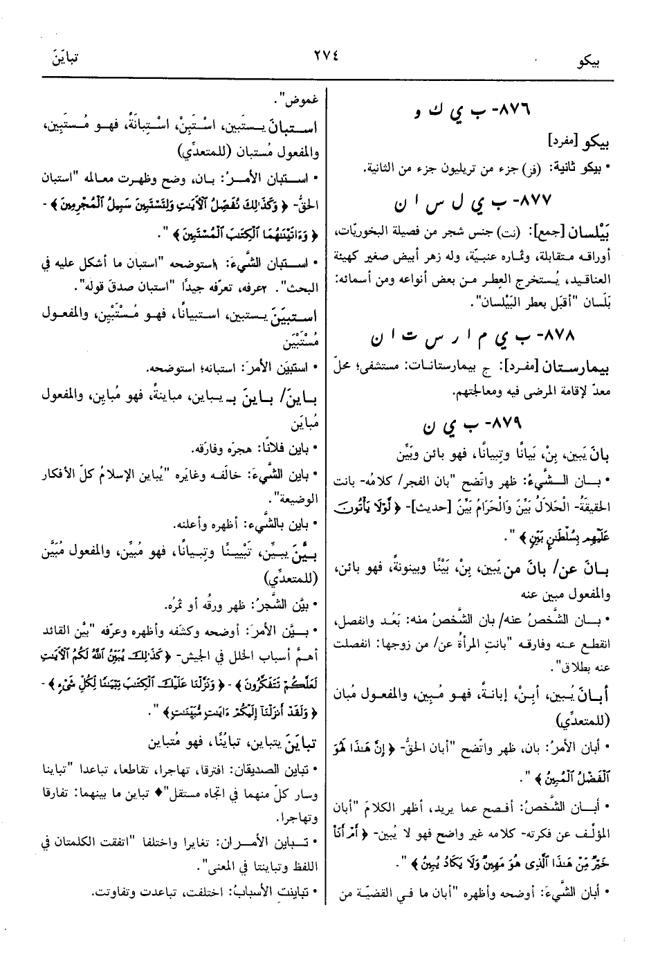 • بان الشَّيءُ: ظهر واتّضح "بان الفجر/ كلامُه- بانت الحقيقَةُ- الْحَلاَلُ بَيِّنٌ وَالْحَرَامُ بَيِّنٌ [حديث]- {لَوْلاَ يَأْتُونَ عَلَيْهِمْ بِسُلْطَانٍ بَيِّنٍ} ".
