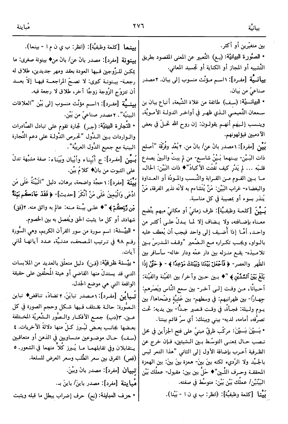 بَيْنَ [كلمة وظيفيَّة]: ظرف زمانيّ أو مكانيّ مبهم يتَّضح معناه بإضافته، ولا يضاف إلا لما يدلّ على أكثر من واحد، أمَّا إذا أُضيف إلى واحد فيجب أن يُعطف عليه بالواو، ويجب تكراره مع الضَّمير "وقف المدرسُ بين تلاميذه- يقع منزله بين دار عمّه ودار خاله- سأسافر بين الظّهر والعصر- {فَاجْعَلْ بَيْنَنَا وَبَيْنَكَ مَوْعِدًا} - {حَتَّى إِذَا بَلَغَ بَيْنَ السَّدَّيْنِ} " ° بين حين وآخر/ بين الفَيْنة والفَيْنة: أحيانًا، من وقت إلى آخر- بين سمع النَّاس وبَصَرهم: جِهارًا- بين ظهرانيهم: في وسطهم- بين عَشِيَّةٍ وضُحاها/ بين يوم وليلة: فجأةً، في وقت قصير جدًّا- بين يديه: تحت تصرُّفه، أمامه، لديه- بيني وبينك: أي سرّ قائم بيننا.