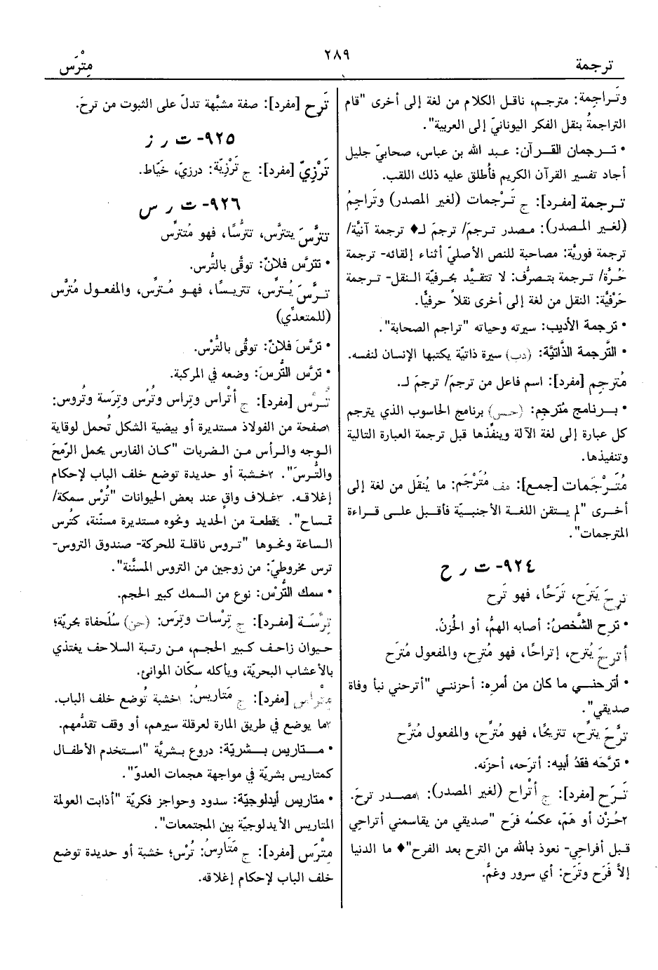 ترجمة [مفرد]: ج تَرْجمات (لغير المصدر) وتَراجِمُ (لغير المصدر): مصدر ترجمَ/ ترجمَ لـ ° ترجمة آنيَّة/ ترجمة فوريَّة: مصاحبة للنص الأصليّ أثناء إلقائه- ترجمة حَرْفيَّة: النقل من لغة إلى أخرى نقلاً حرفيًّا- ترجمة حُرَّة/ ترجمة بتصرُّف: لا تتقيَّد بحرفيّة النقل.