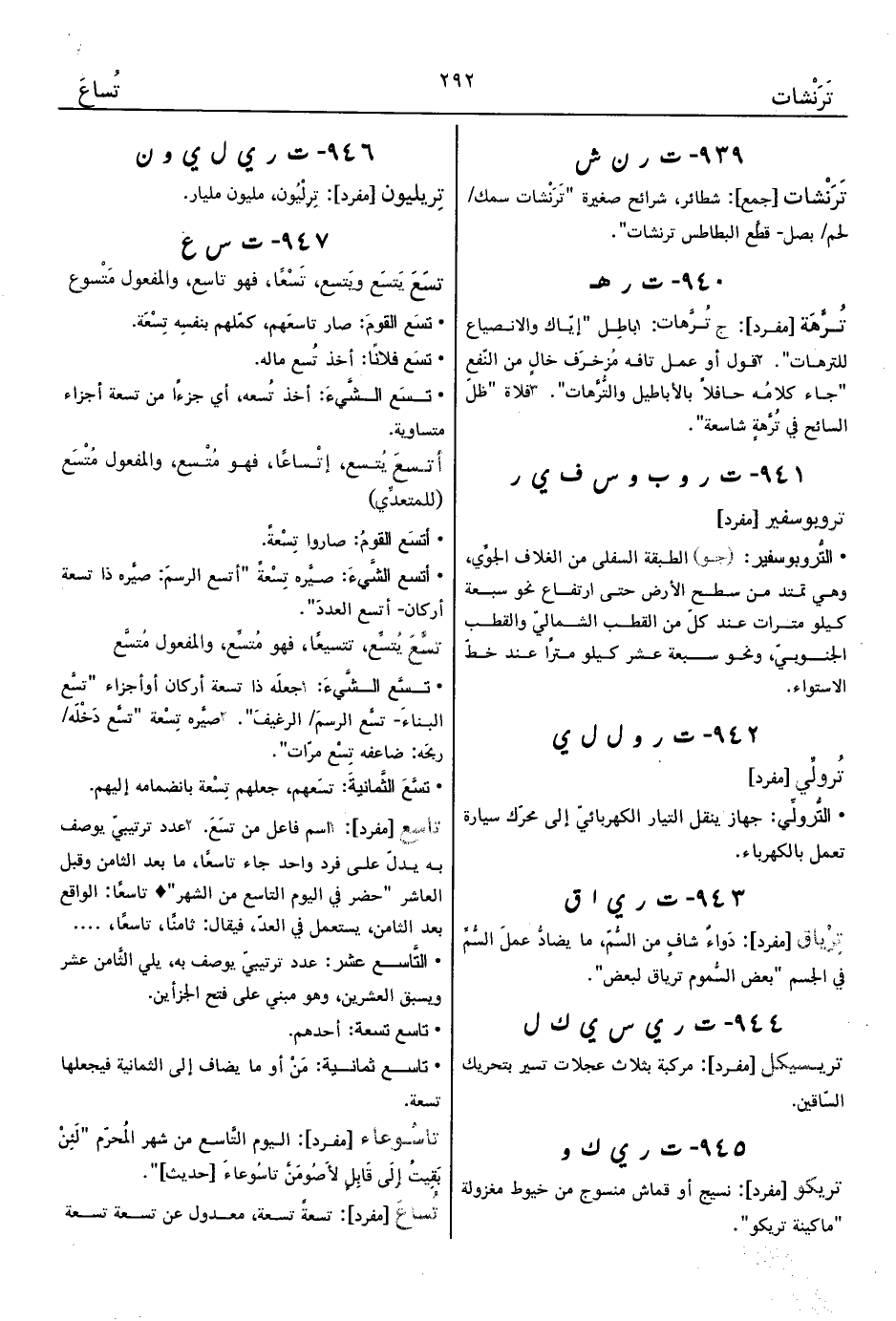 2 - عدد ترتيبيّ يوصف به يدلّ على فرد واحد جاء تاسعًا، ما بعد الثامن وقبل العاشر "حضر في اليوم التاسع من الشهر" ° تاسعًا: الواقع بعد الثامن، يستعمل في العدّ، فيقال: ثامنًا، تاسعًا، ....