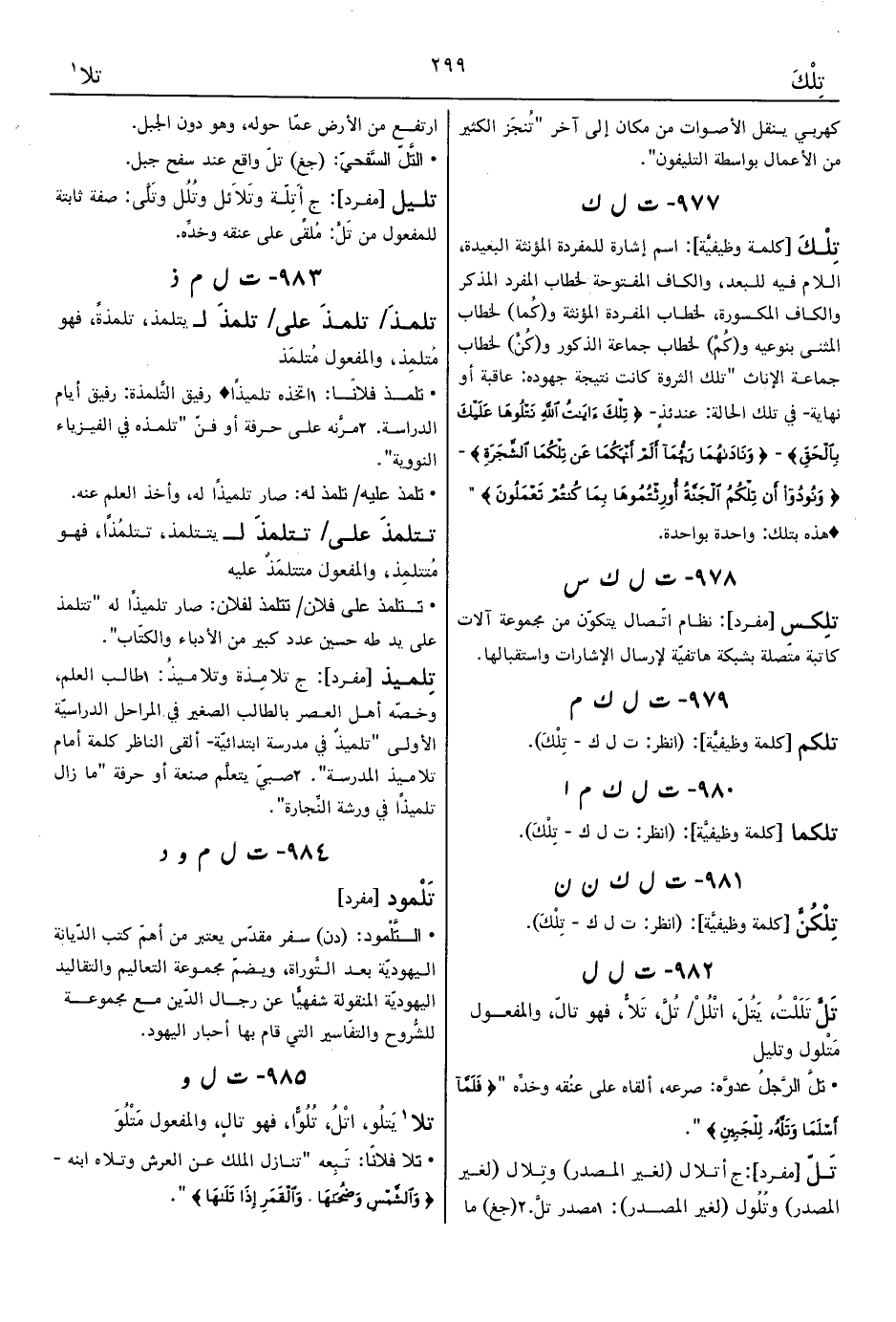 • التَّلْمود: (دن) سفر مقدّس يعتبر من أهمّ كتب الدّيانة اليهوديّة بعد التَّوراة، ويضمّ مجموعة التعاليم والتقاليد اليهوديّة المنقولة شفهيًّا عن رجال الدّين مع مجموعة للشُّروح والتفّاسير التي قام بها أحبار اليهود.