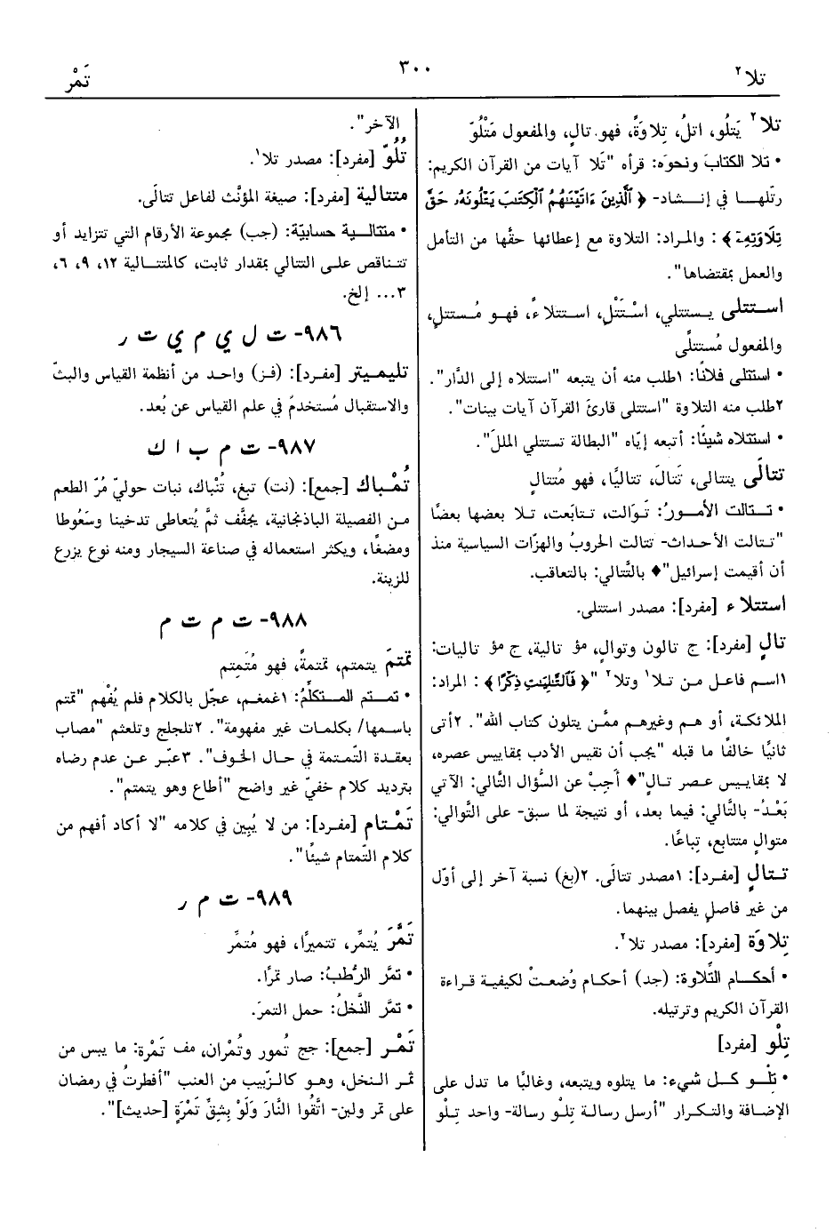 • تلا الكتابَ ونحوَه: قرأه "تَلا آيات من القرآن الكريم: رتّلها في إنشاد- {الَّذِينَ ءَاتَيْنَاهُمُ الْكِتَابَ يَتْلُونَهُ حَقَّ تِلاَوَتِهِ}: والمراد: التلاوة مع إعطائها حقَّها من التأمل والعمل بمقتضاها".