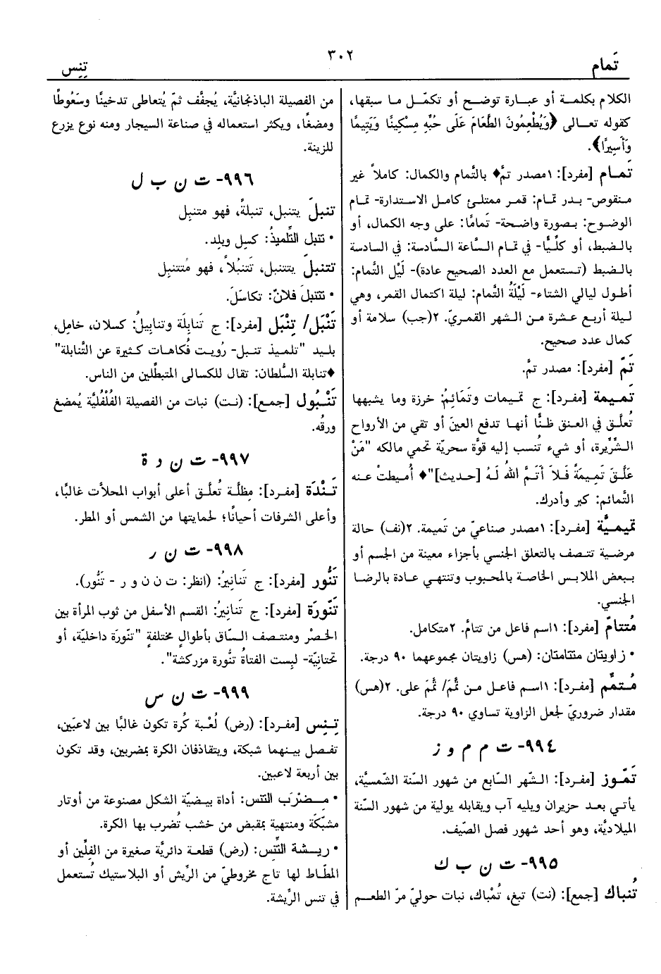 1 - مصدر تمَّ ° بالتَّمام والكمال: كاملاً غير منقوص- بدر تمام: قمر ممتلئ كامل الاستدارة- تَمامًا: على وجه الكمال، أو بالضبط، أو كلِّيًّا- تمام الوضوح: بصورة واضحة- في تمام السَّاعة السَّادسة: في السادسة بالضبط (تستعمل مع العدد الصحيح عادة) - لَيْل التَّمام: أطول ليالي الشتاء- لَيْلَةُ التَّمام: ليلة اكتمال القمر، وهي ليلة أربع عشرة من الشهر القمريّ.