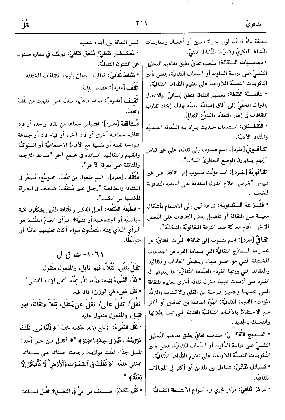 ثقافيّ [مفرد]: اسم منسوب إلى ثقافة ° التُّراث الثقافيّ: هو مجموعة النماذج الثقافيَّة التي يتلقاها الفرد من الجماعات المختلفة التي هو عضو فيها، ويتضمّن العادات والتقاليد والعقائد التي ورثها الفرد- الصَّدمة الثَّقافيَّة: ما يتعرض له الفرد من أزمات نتيجة دخول ثقافة أخرى مغايرة للثقافة التي يحملها وتتميز بمرحلة من القلق والاكتئاب والتردُّد المؤقت- الفجوة الثقافيَّة: الهُوّة القائمة بين ثقافتين أو أكثر مع الاحتفاظ بالأنماط الثقافيّة القديمة التي ثبت بطلانها والتمسك بالجديد.