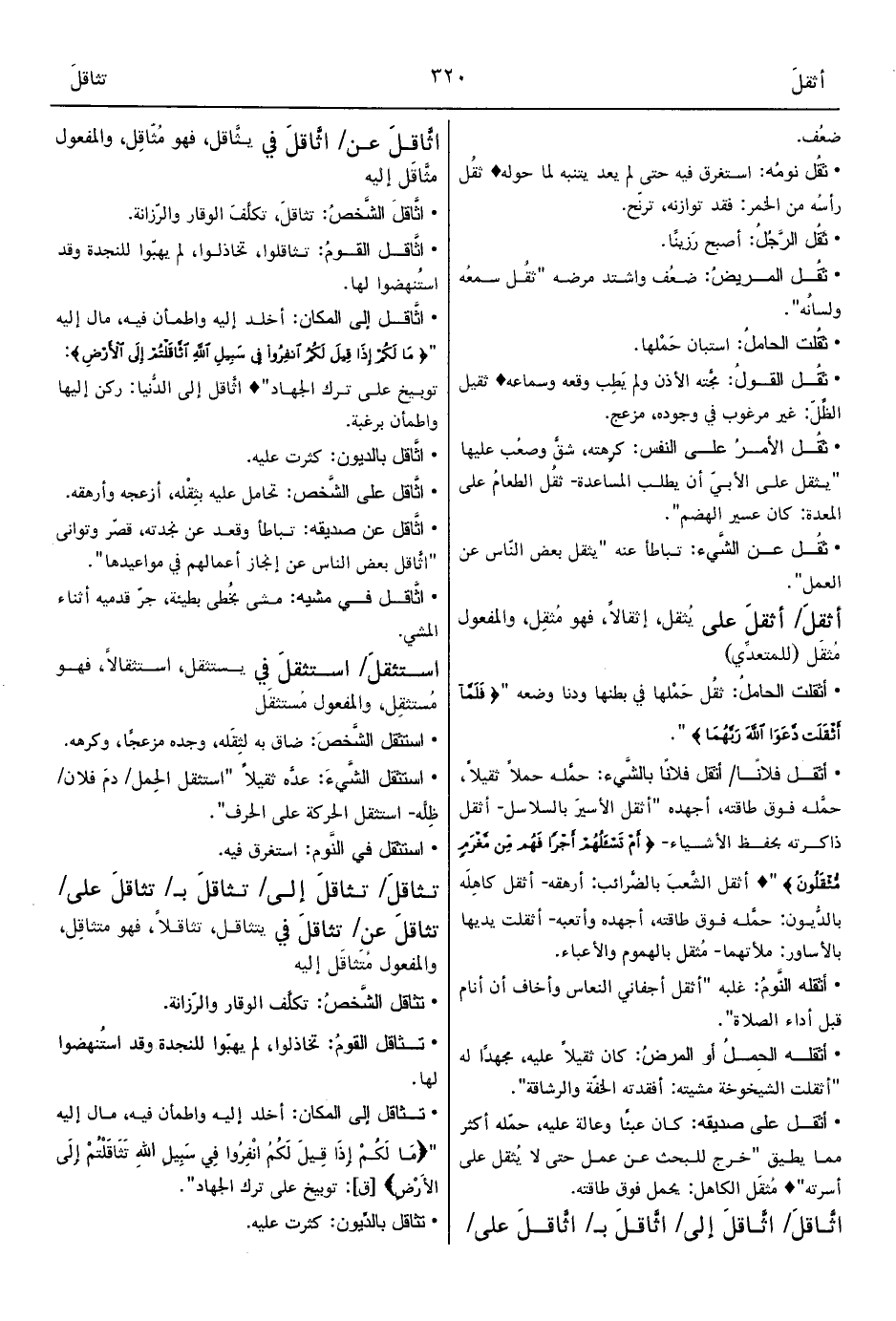• تثاقل إلى المكان: أخلد إليه واطمأن فيه، مال إليه " {مَا لَكُمْ إِذَا قِيلَ لَكُمُ انْفِرُوا فِي سَبِيلِ اللهِ تَثَاقَلْتُمْ إِلَى الأَرْضِ} [ق]: توبيخ على ترك الجهاد".
