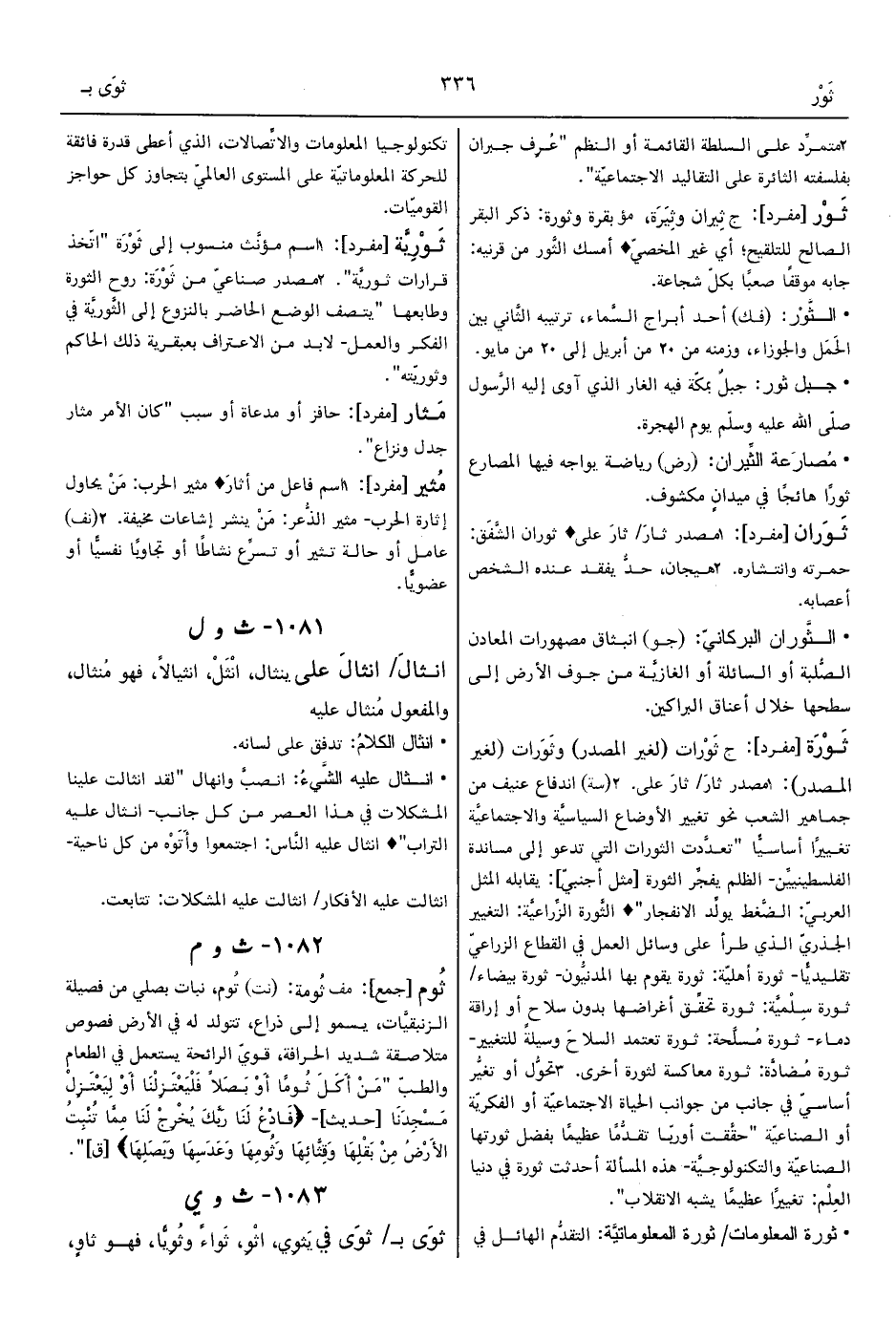 2 - (سة) اندفاع عنيف من جماهير الشعب نحو تغيير الأوضاع السياسيَّة والاجتماعيَّة تغييرًا أساسيًّا "تعدَّدت الثورات التي تدعو إلى مساندة الفلسطينييِّن- الظلم يفجِّر الثورة [مثل أجنبيّ]: يقابله المثل العربيّ: الضَّغط يولِّد الانفجار" ° الثَّورة الزِّراعيَّة: التغيير الجذريّ الذي طرأ على وسائل العمل في القطاع الزراعيّ تقليديًّا- ثورة أهليّة: ثورة يقوم بها المدنيُّون- ثورة بيضاء/ ثورة سِلْميَّة: ثورة تحقِّق أغراضها بدون سلاح أو إراقة دماء- ثورة مُسلَّحة: ثورة تعتمد السلاحَ وسيلةً للتغيير- ثورة مُضادَّة: ثورة معاكسة لثورة أخرى.