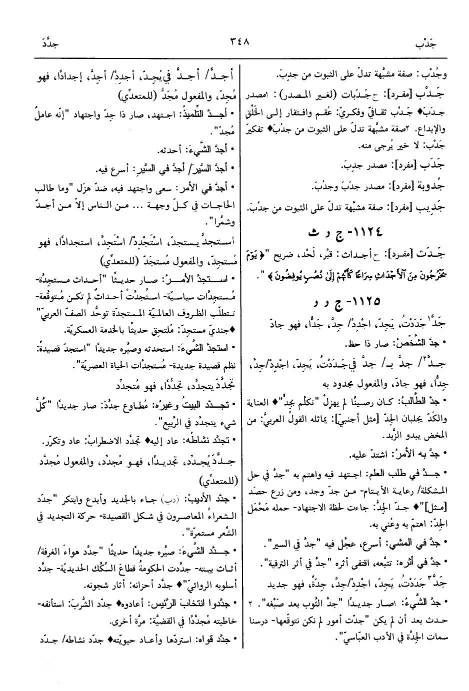 • استجدَّ الأمرُ: صار حديثًا "أحداث مستجِدَّة- مُستجِدَّات سياسيّة- استُجدَّتْ أحداثٌ لم تكن مُتوقَّعة- تتطلّب الظروف العالميّة المستجدّة توحُّد الصفّ العربيّ" ° جنديّ مستجِدّ: مُلتحِق حديثًا بالخدمة العسكريّة.
