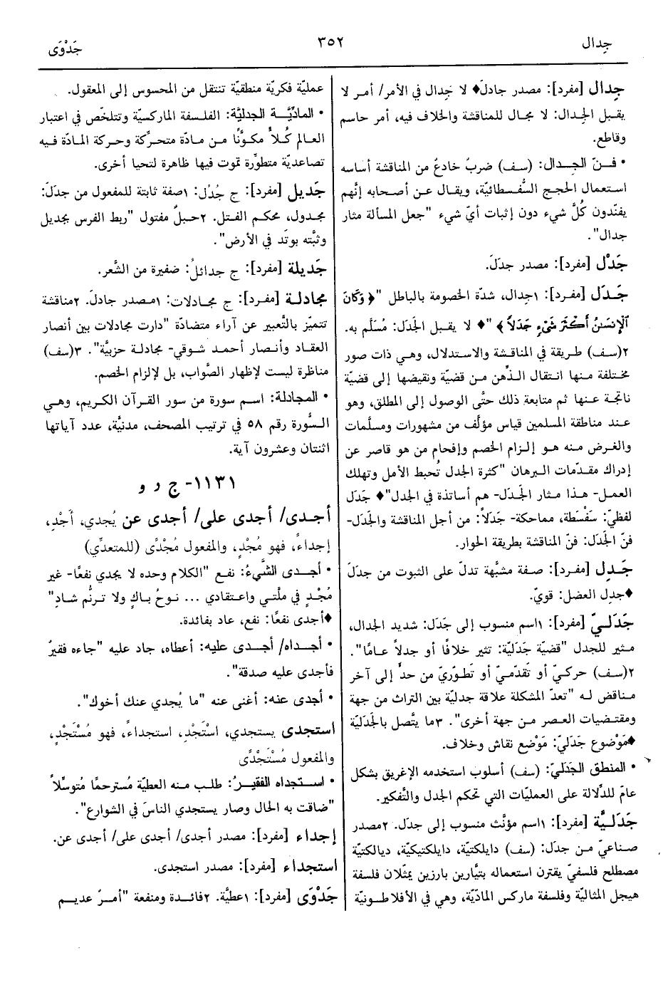 1 - جِدال، شدّة الخصومة بالباطل " {وَكَانَ الإِنْسَانُ أَكْثَرَ شَيْءٍ جَدَلاً} " ° لا يقبل الجَدَل: مُسَلَّم به.