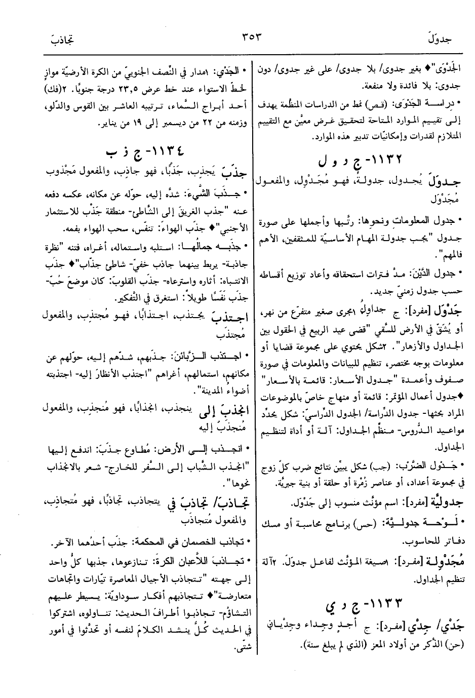 2 - شكل يحتوي على مجموعة قضايا أو معلومات بوجه مختصر، تنظيم للبيانات والمعلومات في صورة صفوف وأعمدة "جدول الأسعار: قائمة بالأسعار" ° جدول أعمال المؤتمر: قائمة أو منهاج خاصّ بالموضوعات المراد بحثها- جدول الدِّراسة/ الجدول الدِّراسيّ: شكل يحدِّد مواعيد الدُّروس- منظِّم الجداول: آلة أو أداة لتنظيم الجداول.