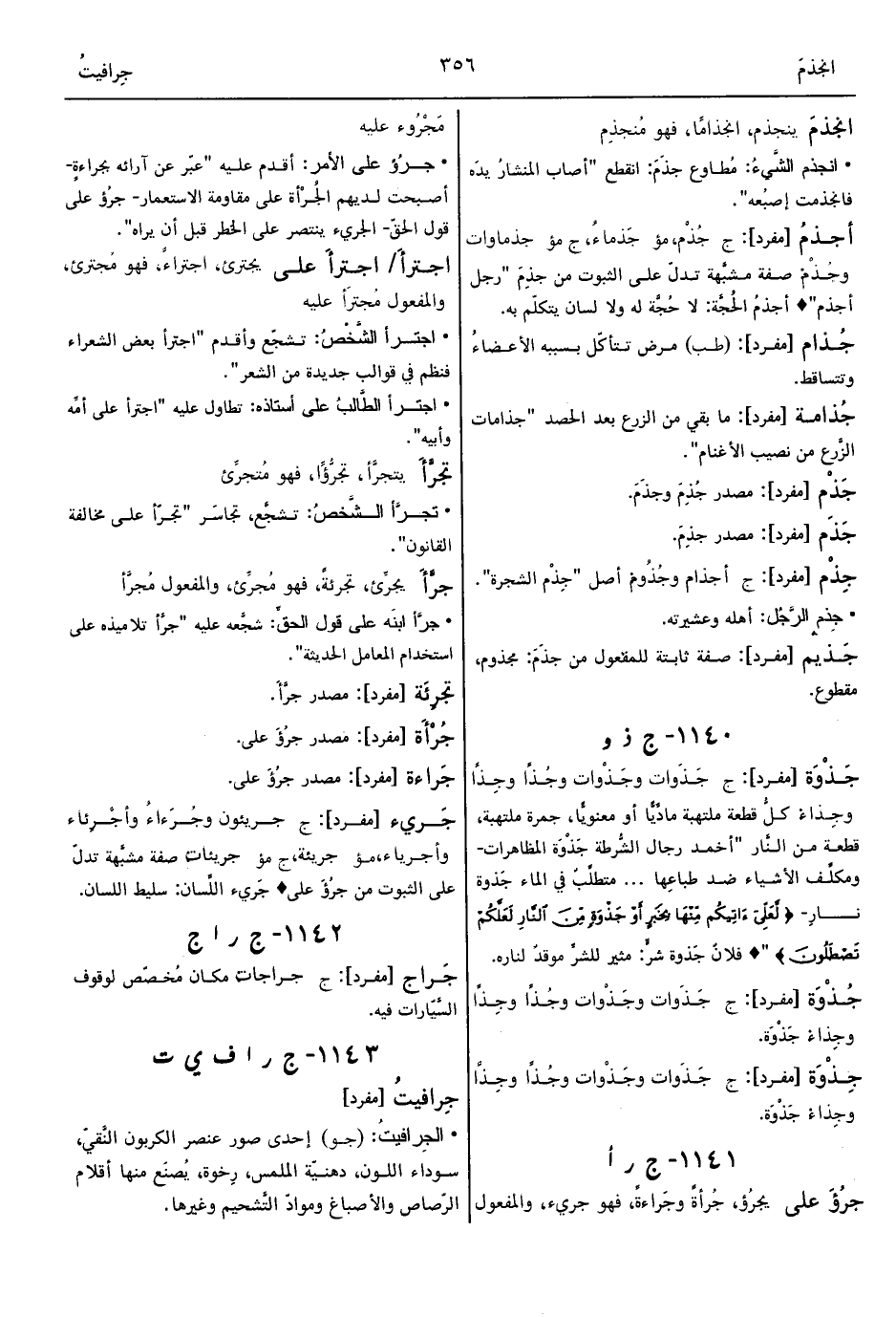 • جرُؤ على الأمر: أقدم عليه "عبّر عن آرائه بجراءةٍ- أصبحت لديهم الجُرْأة على مقاومة الاستعمار- جرُؤ على قول الحقّ- الجريء ينتصر على الخطر قبل أن يراه".