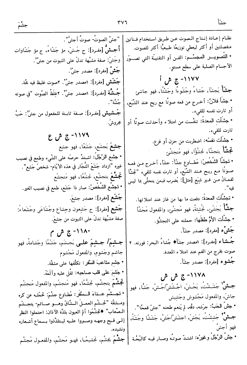 • جشَأ فلانٌ: أخرج من فمه صوتًا مع ريح عند الشِّبَع، أو ثارت نفسه للقيء.