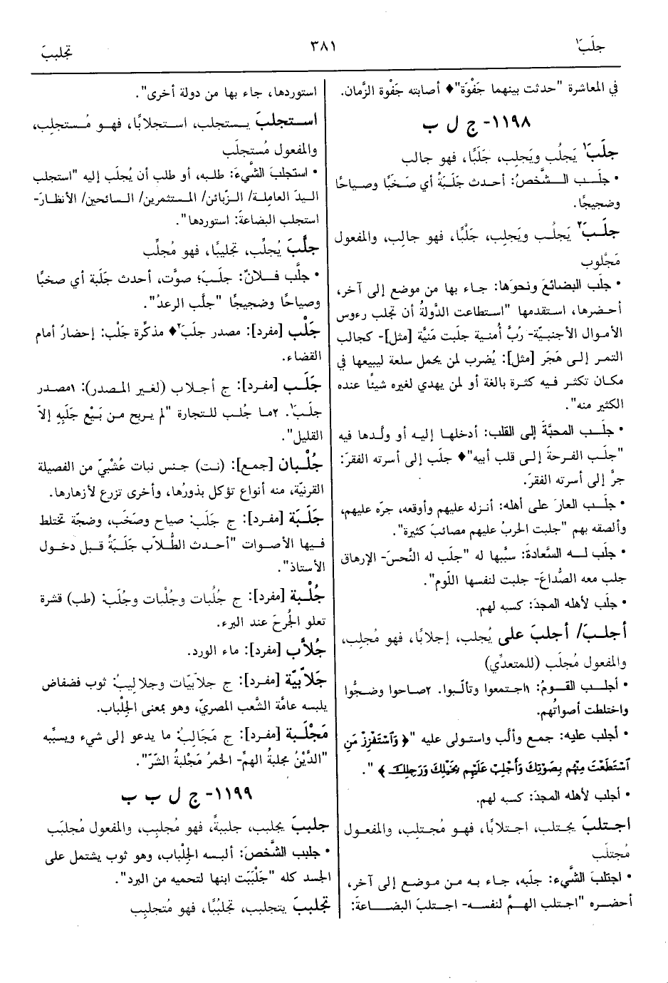 -[382]- • تجلبب الشَّخْصُ: مُطاوع جلببَ: لبِس الجِلْبَابَ، وهو ثوب يشتمل على الجسد كلِّه.