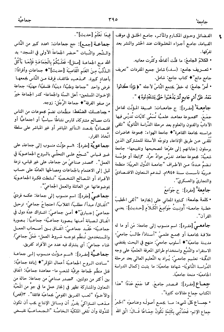 1 - اسم مؤنَّث منسوب إلى جماعة: "سادت الروح الجماعيّة أعمال المؤتمر" ° إبادة جماعيَّة: قتل منظَّم لجماعة عِرقيَّة لشعبٍ ما- معاهدة جماعيَّة: اتّفاق بين أكثر من دولتين.