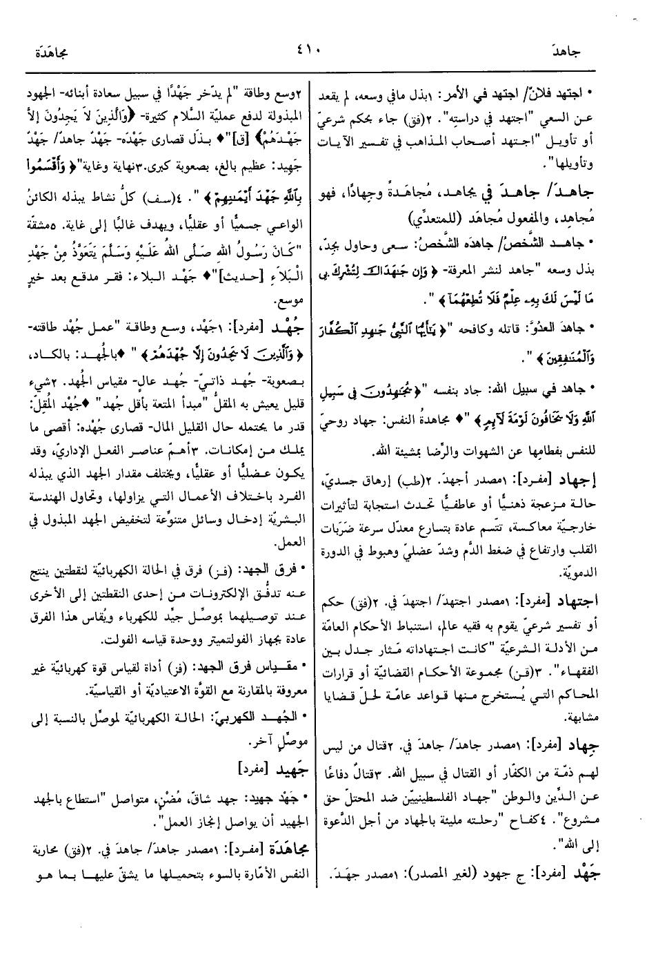 • جاهد في سبيل الله: جاد بنفسه " {يُجَاهِدُونَ فِي سَبِيلِ اللهِ وَلاَ يَخَافُونَ لَوْمَةَ لاَئِمٍ} " ° مجاهدةُ النفس: جهاد روحيّ للنفس بفطامِها عن الشهوات والرِّضا بمشيئة الله.