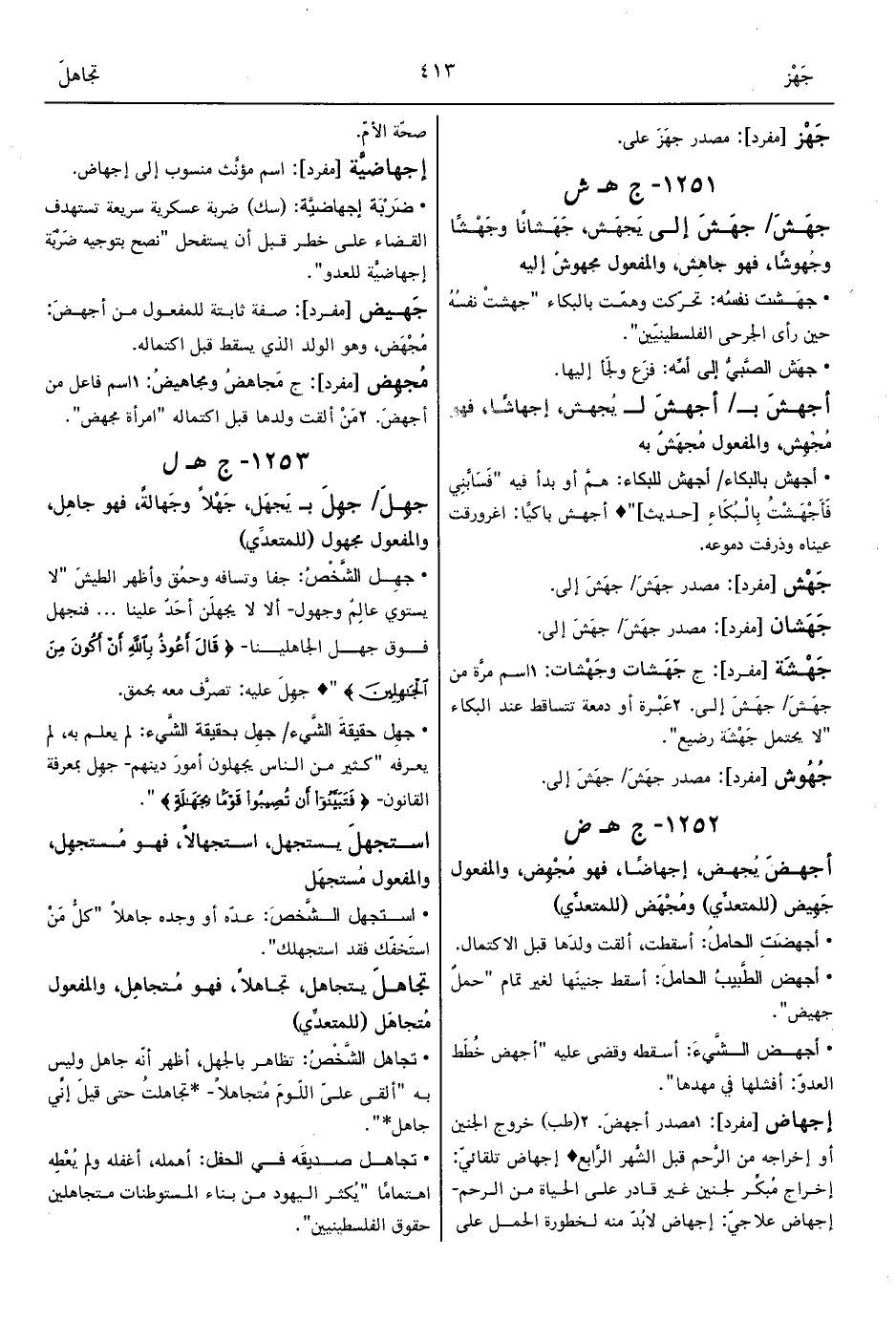 • جهِل الشَّخْصُ: جفا وتسافه وحمُق وأظهر الطيشَ "لا يستوي عالِمٌ وجهول- ألا لا يجهلَن أحَدٌ علينا ... فنجهل فوق جهل الجاهلينا- {قَالَ أَعُوذُ بِاللهِ أَنْ أَكُونَ مِنَ الْجَاهِلِينَ} " ° جهِلَ عليه: تصرَّف معه بحمق.