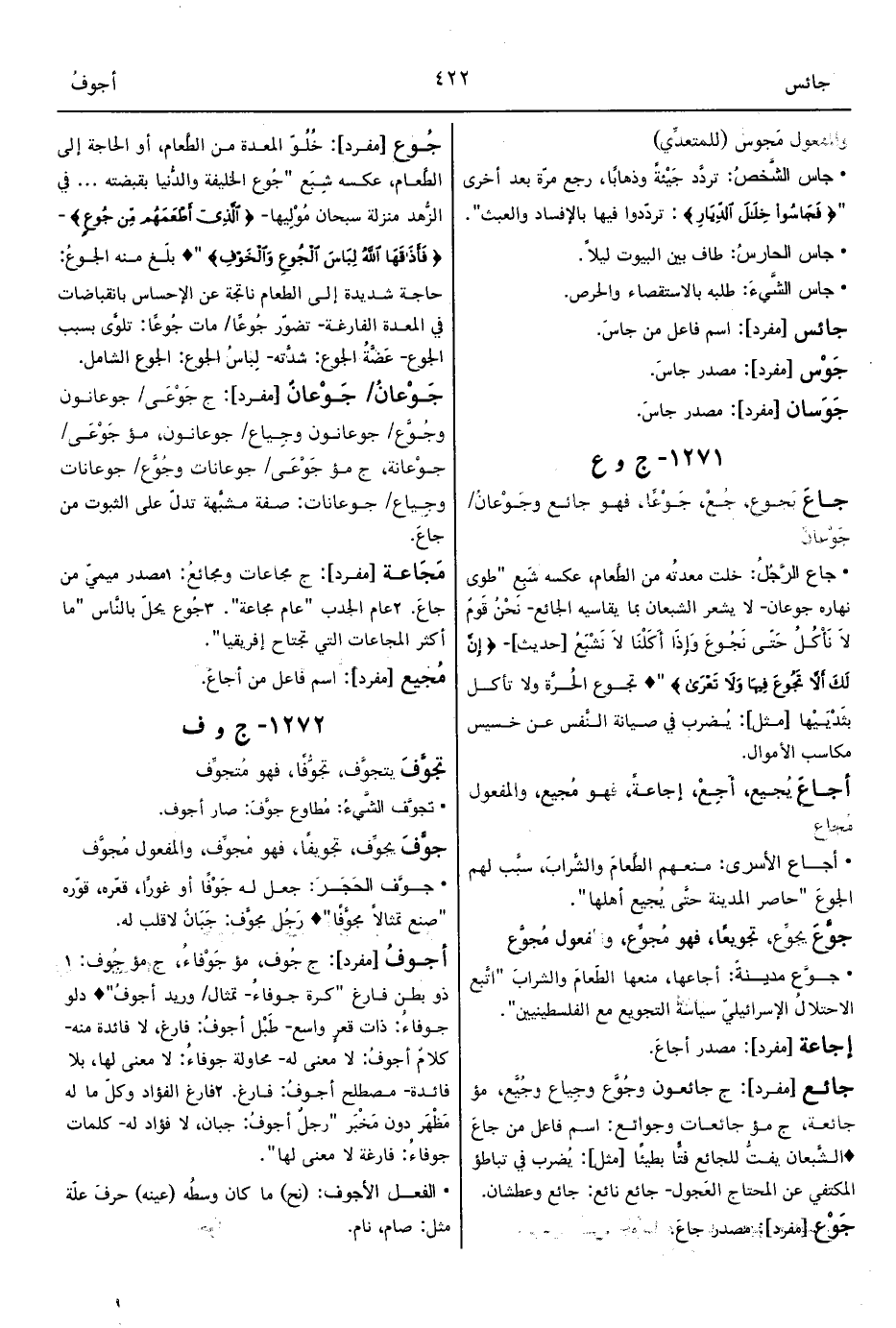 • جاع الرَّجُلُ: خلت معدتُه من الطَّعام، عكسه شَبِع "طوى نهاره جوعان- لا يشعر الشبعان بما يقاسيه الجائع- نَحْنُ قَومٌ لاَ نَأْكُلُ حَتّى نَجُوعَ وَإِذَا أَكَلْنَا لاَ نَشْبَعُ [حديث]- {إِنَّ لَكَ أَلاَّ تَجُوعَ فِيهَا وَلاَ تَعْرَى} " ° تجوع الحُرَّة ولا تأكل بثَدْيَيْها [مثل]: يُضرب في صيانة النَّفس عن خسيس مكاسب الأموال.