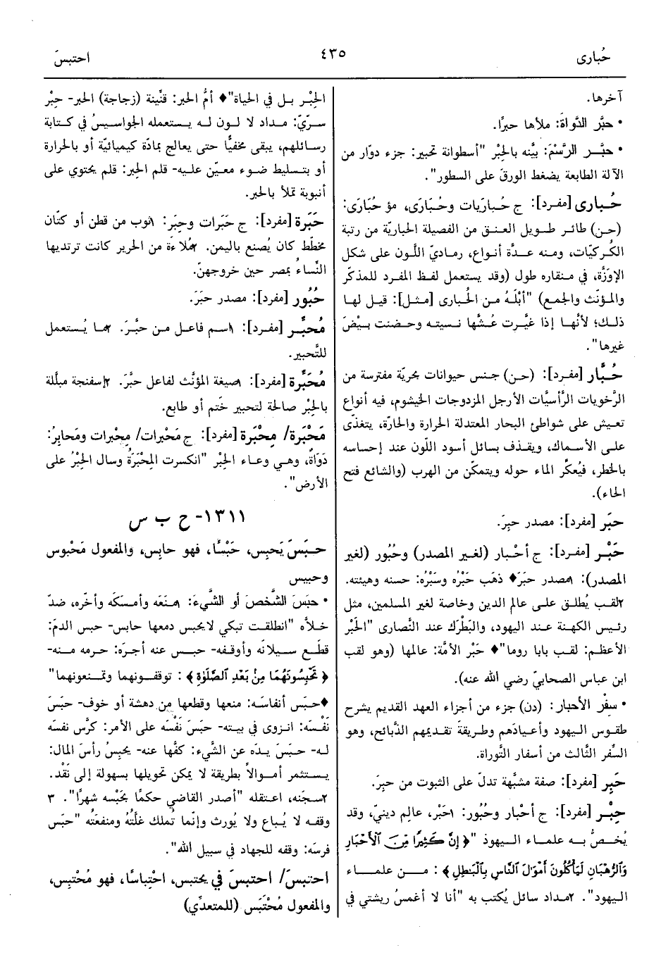 1 - حَبْر، عالِم دينيّ، وقد يُخصُّ به علماء اليهود " {إِنَّ كَثِيرًا مِنَ الأَحْبَارِ وَالرُّهْبَانِ لَيَأْكُلُونَ أَمْوَالَ النَّاسِ بِالْبَاطِلِ}: من علماء اليهود".