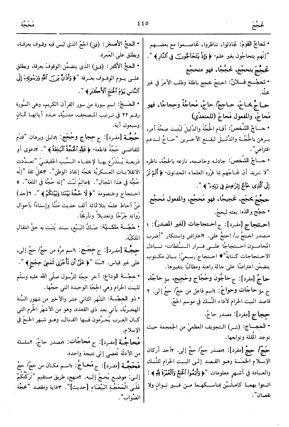 • حاجَّ الشَّخصَ: جادله وخاصمه، نازعه بالحجَّة، ناظره "لا نريد أن نحاجّهم بما قرّره العلماء المحدثون- {أَلَمْ تَرَ إِلَى الَّذِي حَاجَّ إِبْرَاهِيمَ فِي رَبِّهِ} ".