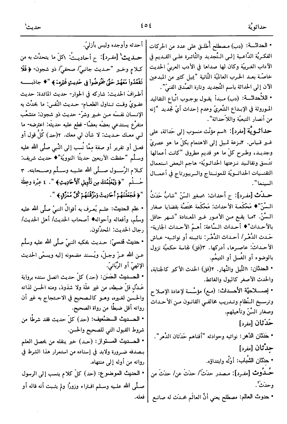 1 - كلّ ما يتحدَّث به من كلامٍ وخبر "حديث جانبيّ/ صحفيّ/ ذو شجون- {فَلاَ تَقْعُدُوا مَعَهُمْ حَتَّى يَخُوضُوا فِي حَدِيثٍ غَيْرِهِ} " ° جاذبه أطرافَ الحديث: شاركه في الحوار- حديث المائدة: حديث عفويّ وقت تناول الطعام- حديث النَّفس: ما يحدِّث به الإنسان نفسَه من خير وشرّ- حديث ذو شجون: متشعِّب متفرِّع يستدعي بعضُه بعضًا- قطع عليه حديثَه: اعترضه- ما لي معك حديث: لا شأن لي معك.