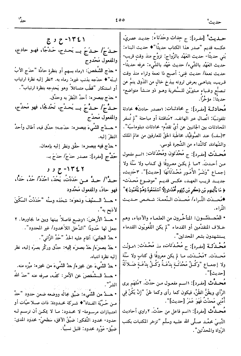 حديث2 [مفرد]: ج حِداث وحُدَثاءُ: جديد عصريّ، عكسه قديم "صدر هذا الكتاب حديثًا" ° حديثًا: مؤخَّرًا- حديث البناء: بُني حديثًا- حديث العَهْد بالزَّواج: تزوَّج منذ وقتٍ قريب- حديث العَهْد بالشَّيء/ حديث عَهْد بالشَّيء: عرفه حديثًا- حديث نعمة/ حديث غِنى: أصبح ذا نعمة وثراء منذ وقت قريب، يتباهى بعرض ثروته ببذخٍ خالٍ من الذّوق ينمُّ عن تصنُّعٍ وغباءٍ مثيرَيْن للسُّخرية وهو ذو منشأ متواضع.