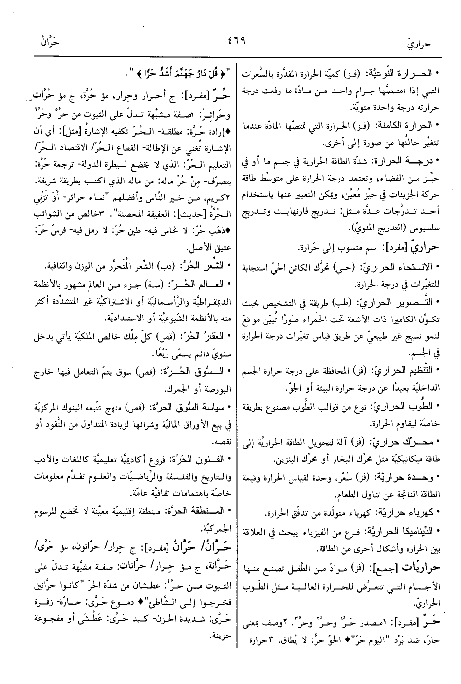 1 - صفة مشبَّهة تدلّ على الثبوت من حرَّ5 وحَرَّ6 ° إرادة حُرَّة: مطلقة- الحُرّ تكفيه الإشارةُ [مثل]: أي أن الإشارة تُغني عن الإطالة- القطاع الحُرّ/ الاقتصاد الحُرّ/ التعليم الحُرّ: الذي لا يخضع لسيطرة الدولة- ترجمة حُرَّة: بتصرّف- مِنْ حُرِّ ماله: من ماله الذي اكتسبه بطريقة شريفة.