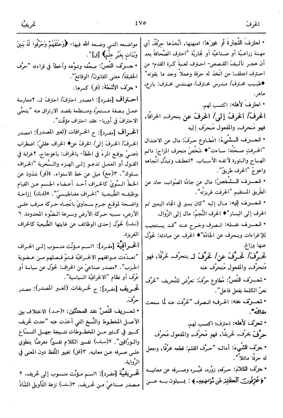 • حرَّف الكلامَ: حرَفه، زوَّره، غيَّره وصرفه عن معانيه " {يُحَرِّفُونَ الْكَلِمَ عَنْ مَوَاضِعِهِ}: يميلون به عن مواضعه التي وضعه الله فيها- {وَخَلَقَهُمْ وَحَرَّفُوا لَهُ بَنِينَ وَبَنَاتٍ بِغَيْرِ عِلْمٍ} [ق] ".