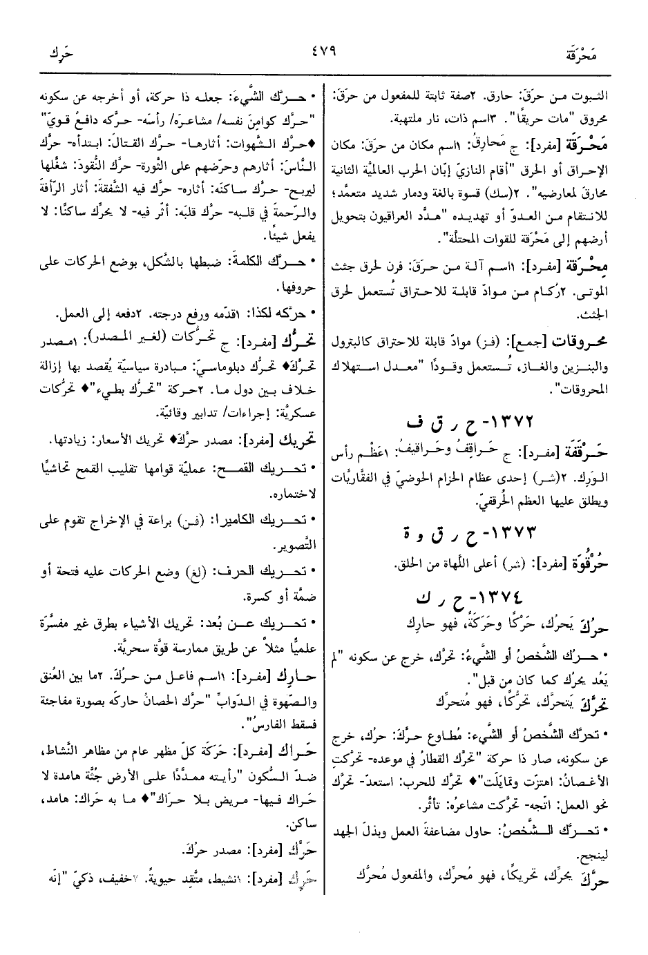 • تحرَّك الشَّخصُ أو الشَّيء: مُطاوع حرَّكَ: حرُك، خرج عن سكونه، صار ذا حركة "تحرَّك القطارُ في موعده- تحرَّكتِ الأغصانُ: اهتزّت وتمايَلَت" ° تحرَّكت مشاعرُه: تأثَّر- تحرَّك للحرب: استعدّ- تحرَّك نحو العمل: اتّجه.