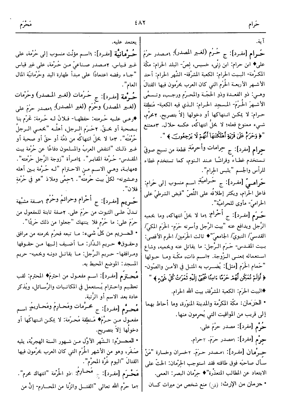 1 - مصدر حرُمَ على ° ابن حرام: ابن زِنًى، خسيس، لِصّ- البلد الحرام: مكَّة المكرَّمة- البيت الحرام: الكعبة المشرَّفة- الشَّهر الحرام: أحد الأشهر الأربعة الحُرُم التي كان العرب يحرِّمون فيها القتالَ وهي: ذو القعدة وذو الحجّة والمحرّم ورجب، وتسمَّى الأشهرَ الحُرُمَ- المسجِد الحرام: الذي فيه الكعبة- مَنطِقة حرام: لا يمكن انتهاكها أو دخولها إلاّ بتصريح.