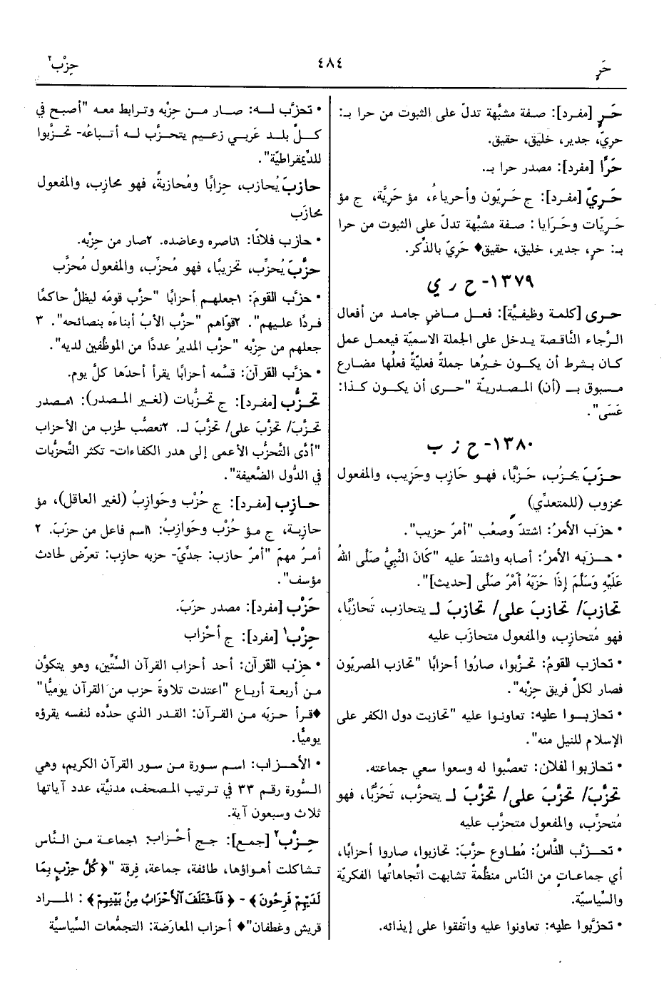 1 - جماعة من النَّاس تشاكلت أهواؤها، طائفة، جماعة، فِرقة " {كُلُّ حِزْبٍ بِمَا لَدَيْهِمْ فَرِحُونَ} - {فَاخْتَلَفَ الأَحْزَابُ مِنْ بَيْنِهِمْ}: المراد قريش وغطفان" ° أحزاب المعارَضة: التجمُّعات السِّياسيَّة