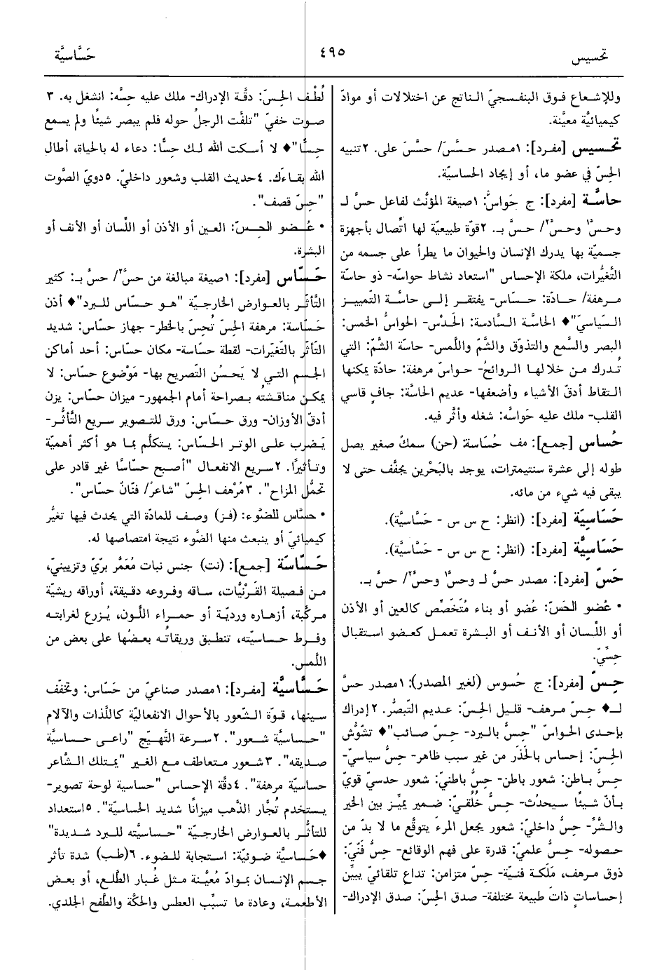 2 - إدراك بإحدى الحواسّ "حِسٌّ بالبرد- حِسّ صائب" ° تشّوُّش الحِسّ: إحساس بالحَذَر من غير سبب ظاهر- حِسٌّ باطن: شعور باطن- حِسٌّ باطنيّ: شعور حدسيّ قويّ بأنّ شيئًا سيحدُث- حِسٌّ خُلُقيّ: ضمير يميِّز بين الخير والشَّرِّ- حِسٌّ داخليّ: شعور يجعل المرءَ يتوقَّع ما لا بدّ من حصوله- حِسٌّ علميّ: قدرة على فهم الوقائع- حِسٌّ فَنّيّ: ذوق مرهف، مَلَكة فنيّة- حِسّ متزامن: تداعٍ تلقائيّ يبيِّن إحساساتٍ ذاتَ طبيعة مختلفة- حِسٌّ سياسيّ- صدق الحِسّ: صدق الإدراك- لُطْف الحِسّ: دقَّة الإدراك- ملك عليه حِسَّه: انشغل به.
