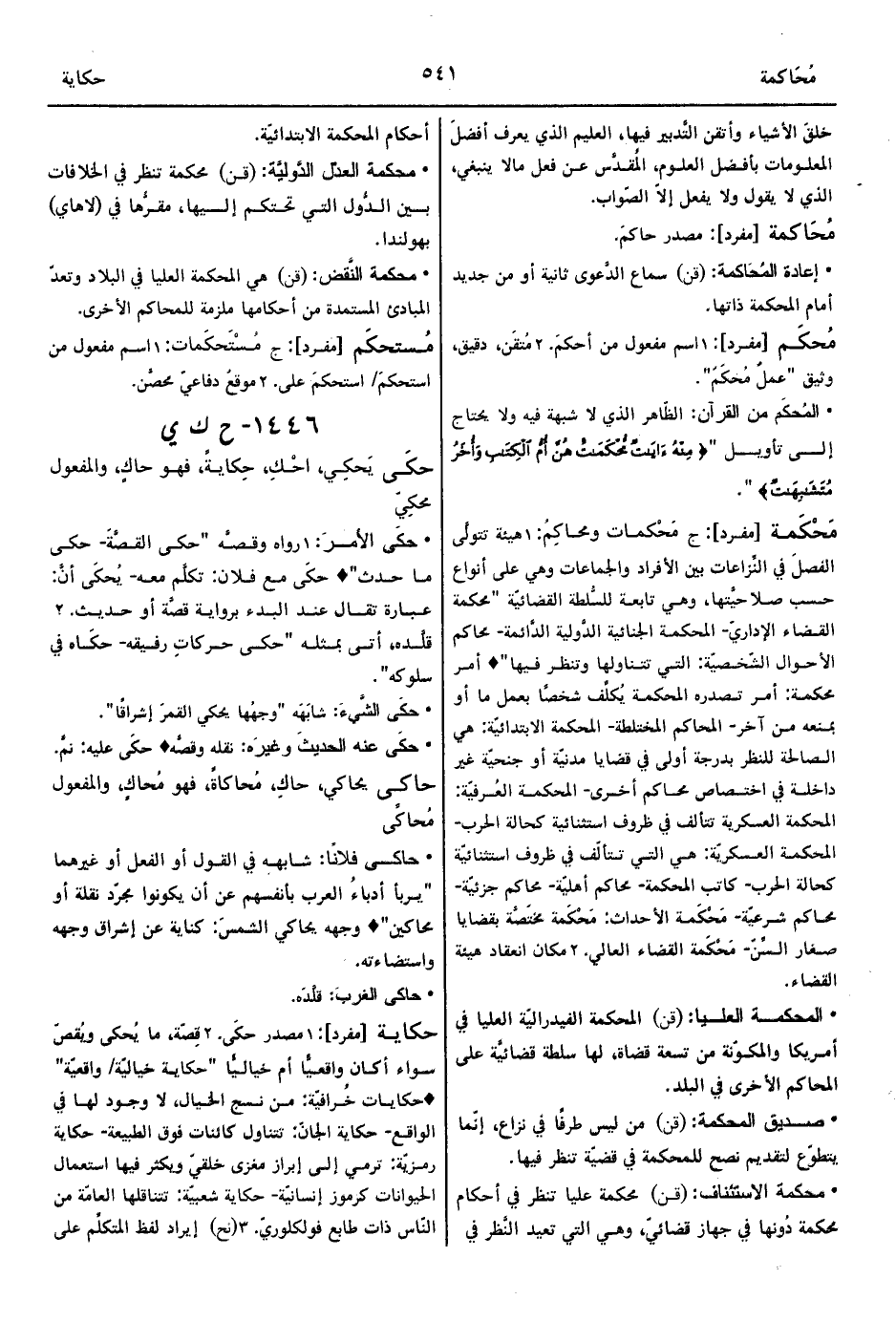 1 - هيئة تتولَّى الفصلَ في النِّزاعات بين الأفراد والجماعات وهي على أنواع حسب صلاحيَّتها، وهي تابعة للسُّلطة القضائيّة "محكمة القضاء الإداريّ- المحكمة الجنائية الدَّولية الدَّائمة- محاكم الأحوال الشّخصيّة: التي تتناولها وتنظر فيها" ° أمر محكمة: أمر تصدره المحكمة يُكلِّف شخصًا بعمل ما أو بمنعه من آخر- المحاكم المختلطة- المحكمة الابتدائيّة: هي الصالحة للنظر بدرجة أولى في قضايا مدنيّة أو جنحيّة غير داخلة في اختصاص محاكم أخرى- المحكمة العُرفيّة: المحكمة العسكرية تتألف في ظروف استثنائية كحالة الحرب- المحكمة العسكريّة: هي التي تتألّف في ظروف استثنائيّة كحالة الحرب- كاتب المحكمة- محاكم أهليّة- محاكم جزئيّة- محاكم شرعيّة- مَحْكَمة الأحداث: مَحْكَمة مختَصَّة بقضايا صغار السِّنّ- مَحْكَمة القضاء العالي.