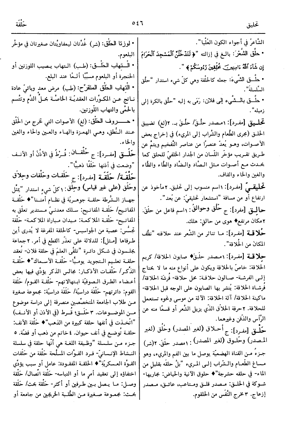 2 - جماعة يجلسون في شكل دائرة "تلقَّى العلمَ في حلقة فلان- تُعقد حلقة تعليم التجويد يوميًّا- حَلْقة الأسماك" ° حَلْقة الذِّكر/ حَلْقات الأذكار: مجالس الذكر يؤدِّي فيها بعض أعضاء الطرق الصوفيّة ابتهالاتهم- حَلْقة القوم/ حَلَقة القوم: دائرتهم- حَلْقَة دراسيّة/ حَلَقَة دراسيّة: مجموعة صغيرة من طلاب الجامعة المتخصِّصين منصرفة إلى دراسة موضوع من الموضوعات.