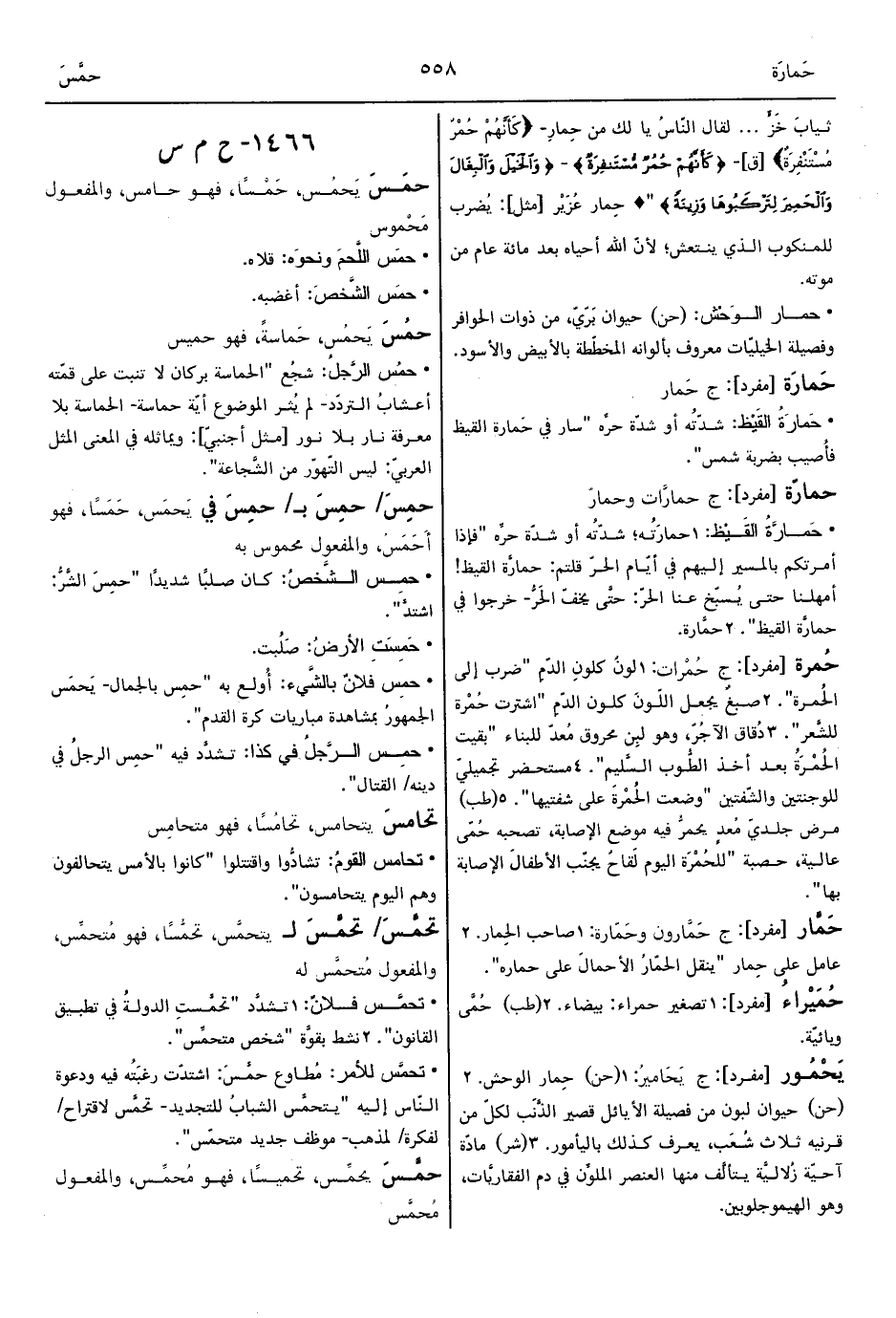 • حمُس الرَّجلُ: شجُع "الحماسة بركان لا تنبت على قمّته أعشابُ التردّد- لم يُثر الموضوع أيّة حماسة- الحماسة بلا معرفة نار بلا نور [مثل أجنبيّ]: ويماثله في المعنى المثل العربيّ: ليس التّهوّر من الشَّجاعة".