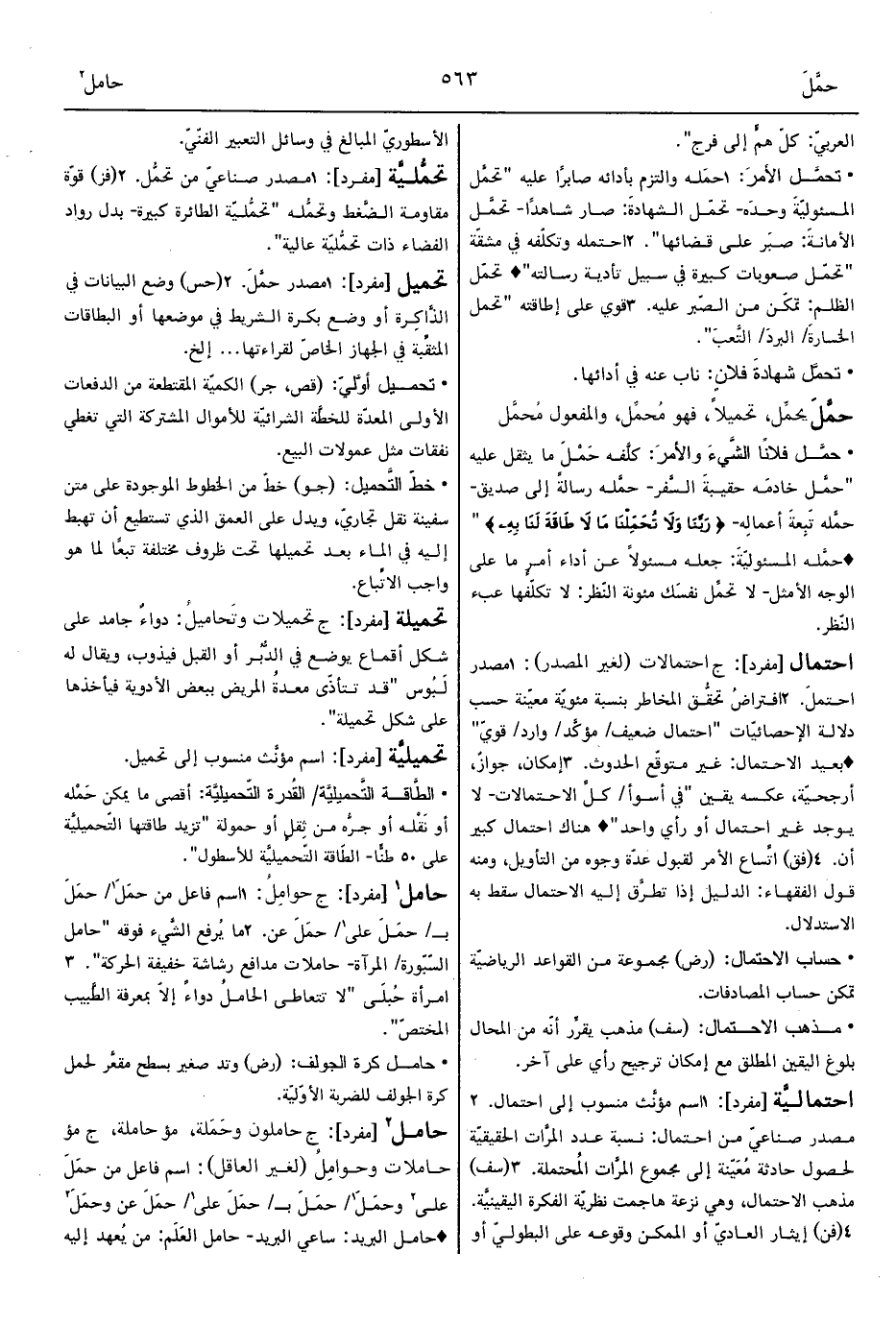 -[564]- حمل العلم- حامل اللِّواء: قائد، ممثّل لحزب سياسيّ- حامل المراكب: صالح لسير السفن- حامل بكالوريوس: من حصل على درجة بكالوريوس من جامعة بعد إكماله الدراسة فيها- حامل شهادة: من نالها- حامل لَقَب: من نال لقبًا ما في الرياضة ونحوها- حَمَلَة الأقلام: الأدباء والمفكِّرون والكُتَّاب- حَمَلَة القرآن: حفظتُه ورواتُه.