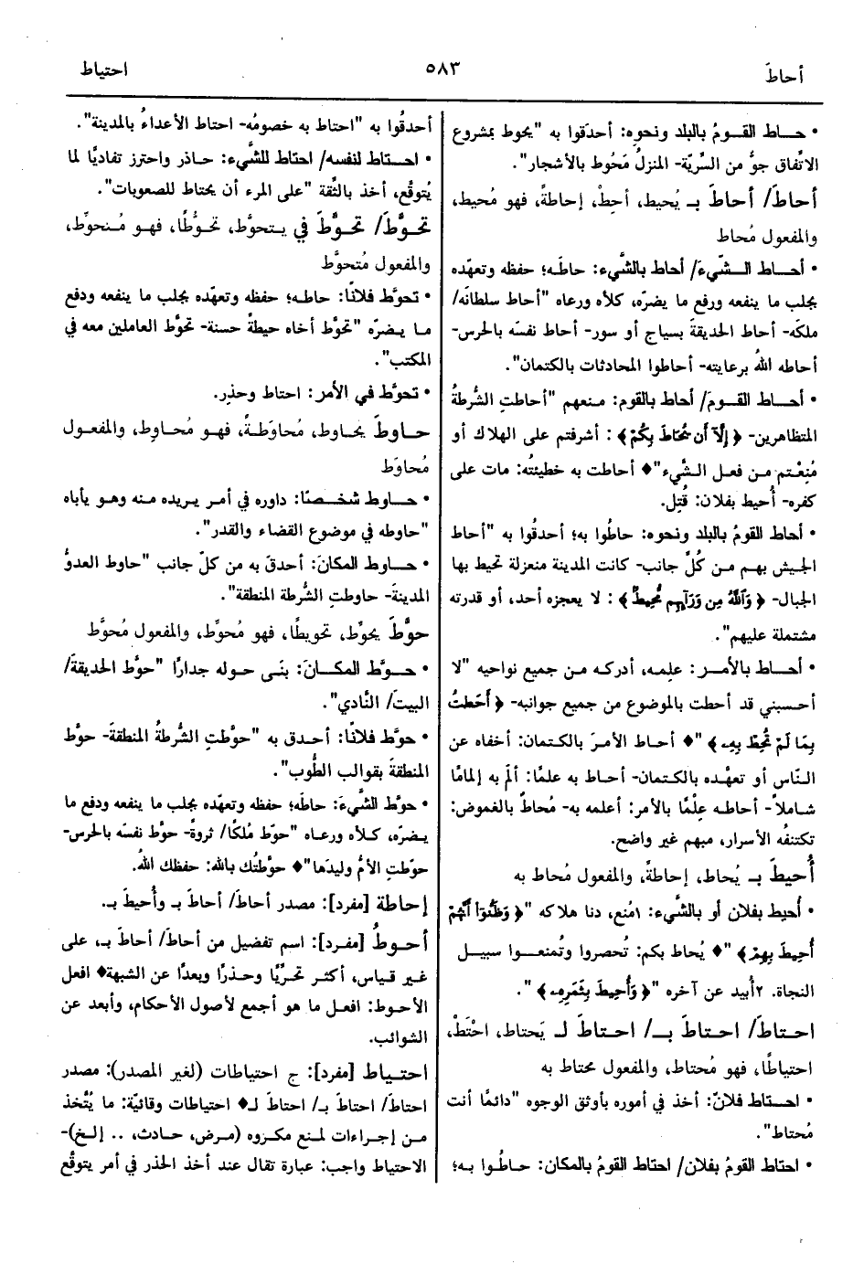 • أحاط القومُ بالبلد ونحوه: حاطُوا به؛ أحدقُوا به "أحاط الجيش بهم من كُلِّ جانب- كانت المدينة منعزلة تحيط بها الجبال- {وَاللهُ مِنْ وَرَائِهِمْ مُحِيطٌ}: لا يعجزه أحد، أو قدرته مشتملة عليهم".
