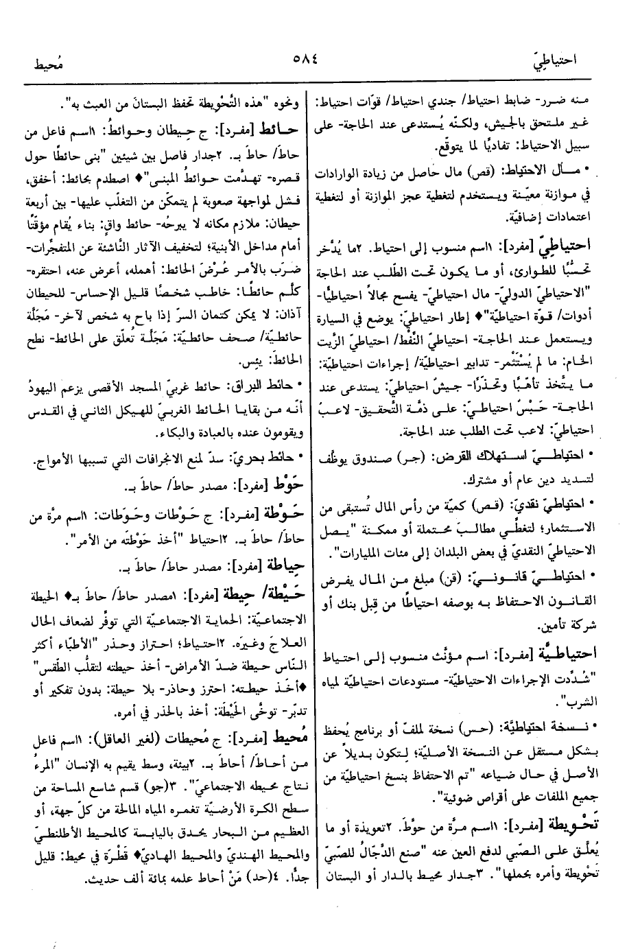 2 - احتياط؛ احتراز وحذر "الأطبّاء أكثر النّاس حيطة ضدّ الأمراض- أخذ حيطته لتقلُّب الطّقس" ° أخَذ حيطته: احترز وحاذر- بلا حيطة: بدون تفكير أو تدبّر- توخَّى الحَيْطَة: أخذ بالحذر في أمره.