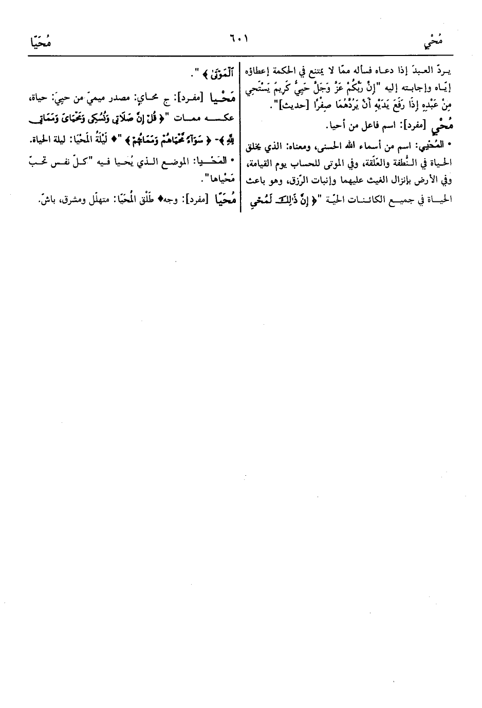 • المُحْيي: اسم من أسماء الله الحسنى، ومعناه: الذي يخلق الحياة في النُّطفة والعَلَقة، وفي الموتى للحساب يوم القيامة، وفي الأرض بإنزال الغيث عليهما وإنبات الرّزق، وهو باعث الحياة في جميع الكائنات الحيّة " {إِنَّ ذَلِكَ لَمُحْيِي الْمَوْتَى} ".