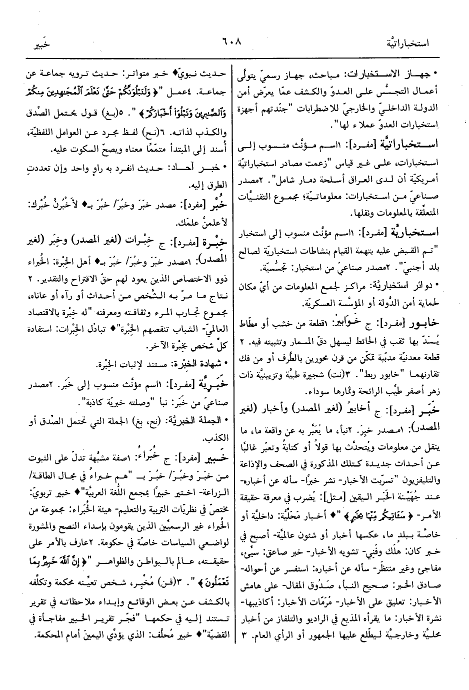 2 - نبأ، ما يُعَبَّر به عن واقعة ما، ما ينقل من معلومات ويُتحدَّث بها قولاً أو كتابةً وتعبّر غالبًا عن أحداث جديدة كتلك المذكورة في الصحف والإذاعة والتليفزيون "تسرّبت الأخبار- نشر خبرًا- سأله عن أخباره- عند جُهَيْنة الخَبَر اليقين [مثل]: يُضرب في معرفة حقيقة الأمر- {سَآتِيكُمْ مِنْهَا بِخَبَرٍ} " ° أخبار مَحَلِّيَّة: داخليَّة أو خاصَّة ببلدٍ ما، عكسها أخبار أو شئون عالميَّة- أصبح في خبر كان: هلَك وفَنِي- تشويه الأخبار- خبر صاعق: سيِّئ، مفاجئ وغير منتظَر- سأله عن أخباره: استفسر عن أحواله- صادق الخبر: صحيح النبأ، صَدُوق المقال- على هامش الأخبار: تعليق على الأخبار- مُرَمّات الأخبار: أكاذيبها- نشرة الأخبار: ما يقرأه المذيع في الراديو والتلفاز من أخبار محليَّة وخارجيَّة ليطّلع عليها الجمهور أو الرأي العام.