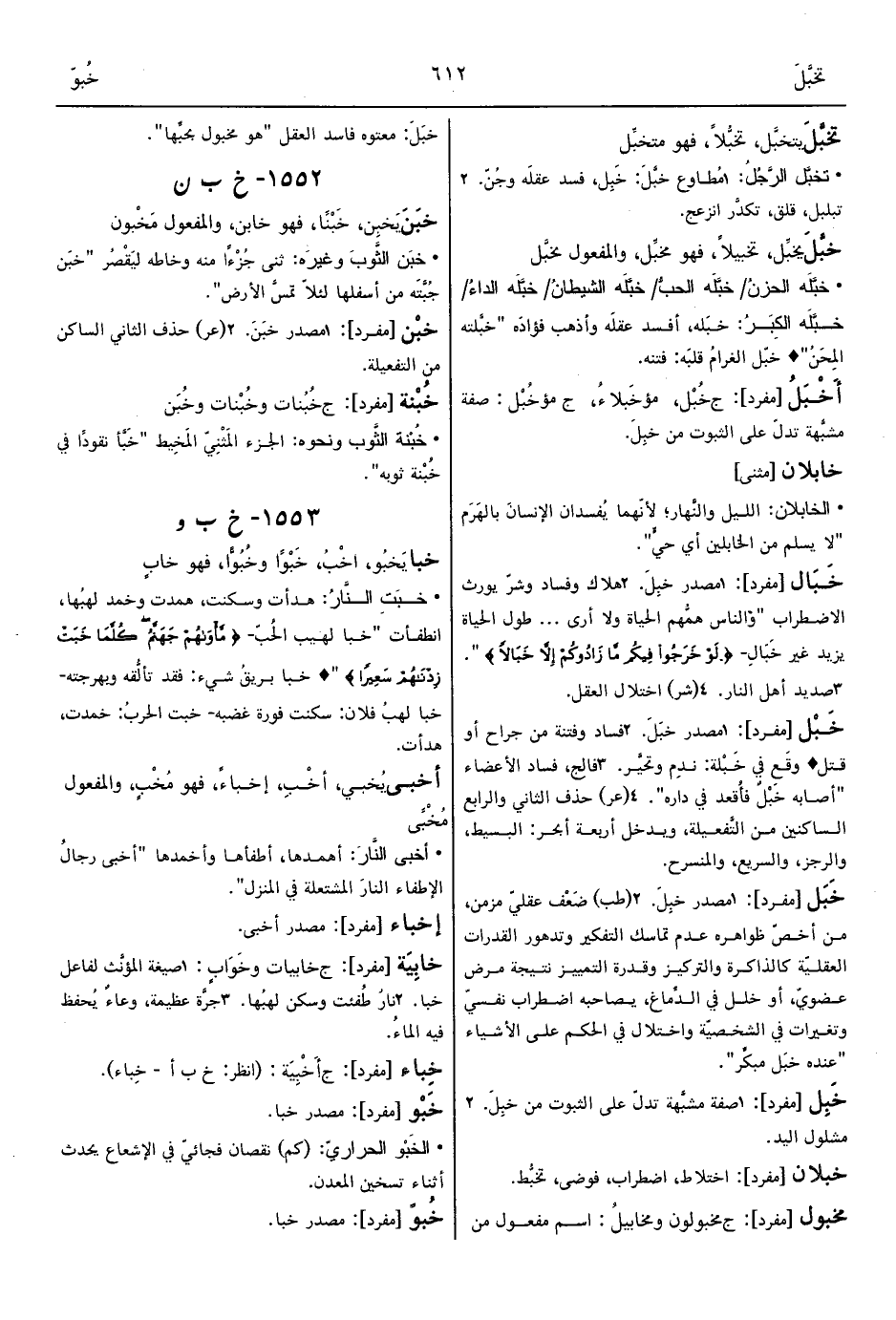 2 - هلاك وفساد وشرّ يورث الاضطراب "والناس همُّهم الحياة ولا أرى ... طول الحياة يزيد غير خَبَالِ- {لَوْ خَرَجُوا فِيكُمْ مَا زَادُوكُمْ إلاَّ خَبَالاً} ".