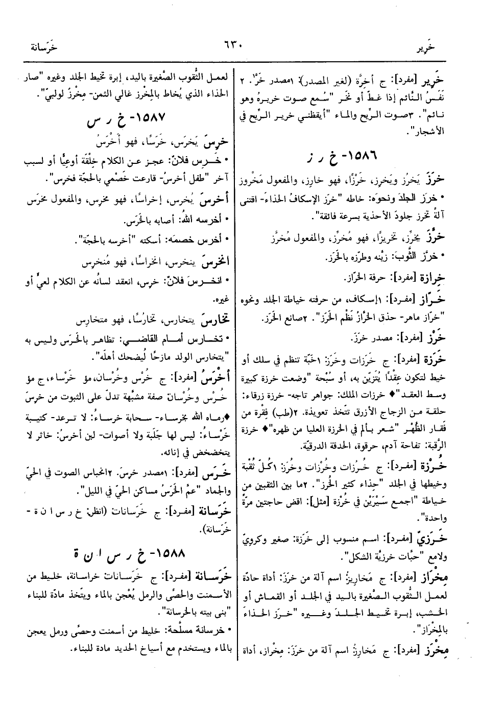 مِخْرَاز [مفرد]: ج مَخارِيزُ: اسم آلة من خرَزَ: أداة حادّة لعمل الثُّقوب الصَّغيرة باليد في الجلد أو القماش أو الخشب، إبرة تخيط الجلدَ وغيره "خرَز الحذاءَ بالمِخْرَاز".