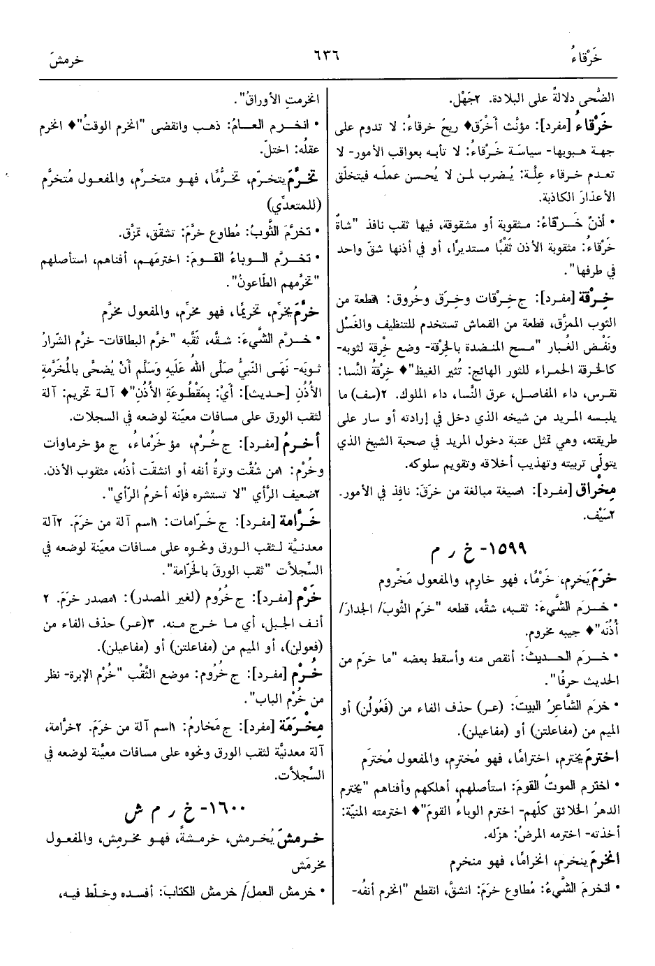 • خرَّم الشَّيءَ: شقَّه، ثَقَّبه "خرَّم البطاقات- خرَّم الشّرارُ ثوبَه- نَهَى النّبيُّ صَلَّى اللهُ عَلَيهِ وَسَلَّم أَنْ يُضحَّى بالمُخَرَّمةِ الأُذُنِ [حديث]: أَيْ: بِمَقْطُوعَةِ الأُذُنِ" ° آلة تخريم: آلة لثقب الورق على مسافات معيّنة لوضعه في السجلات.