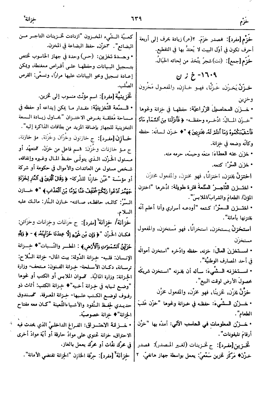 1 - مكان الخَزْن " {وَإِنْ مِنْ شَيْءٍ إلاَّ عِنْدَنَا خَزَائِنُهُ} - {وَلِلَّهِ خَزَائِنُ السَّمَوَاتِ وَالأَرْضِ}: المطر والنّبات" ° خِزانة الإنسان: قلبه- خِزانة الدَّولة: بيت المال- خِزانة السِّلاح: ترسانة، دكان الأسلحة- خِزانة الفنون: متحف- وزارة الخِزانة: وزارة الماليّة.