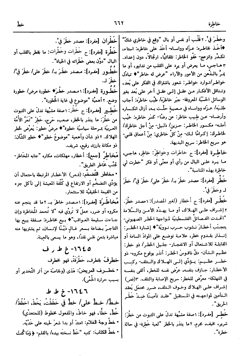 1 - صفة مشبَّهة تدلّ على الثبوت من خطُرَ: ما ينذر بالخطر، صعب، حَرِج، خَطِرٌ "تَمُرُّ الأُمَّة العربيّة بمرحلة سياسيّة خطيرة" ° مرضٌ خطير: يُعرِّض لخطر الهلاك.