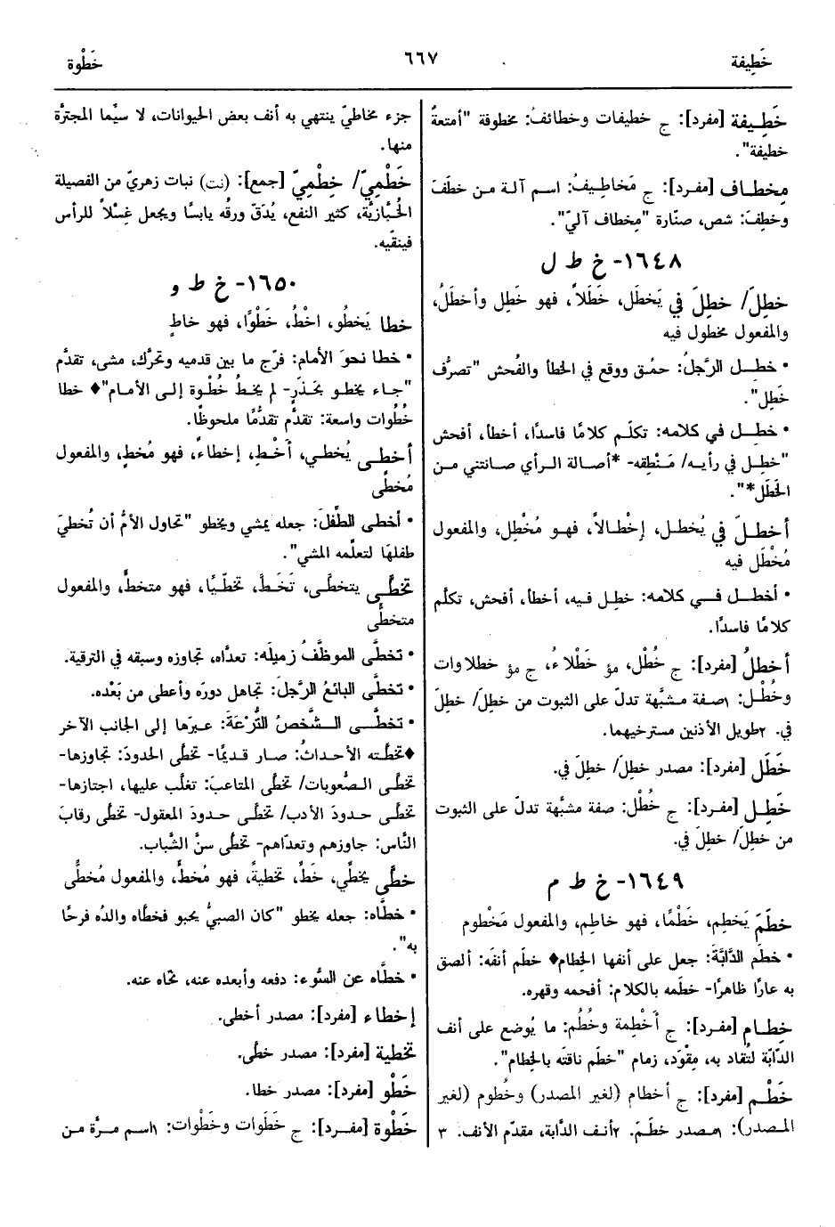 -[668]- خطا: مسافة ما بين الرِّجلين "خطا إلى الأمام خَطْوة كبيرة- {وَلاَ تَتَّبِعُوا خَطَوَاتِ الشَّيْطَانِ} [ق]: طرق تزيينه ووساوسه" ° خَطْوة إلى الأمام: تقدُّم محسوب- خَطْوة عزيزة: كلمة ترحيب بالضَّيف لدى حضوره بعد انقطاع- خَطْوة فخَطْوة/ خَطْوةً خَطْوةً/ خَطْوةً بخَطْوة: بصورة تدريجيّة، بصورة مرتّبة ومتتابعة.