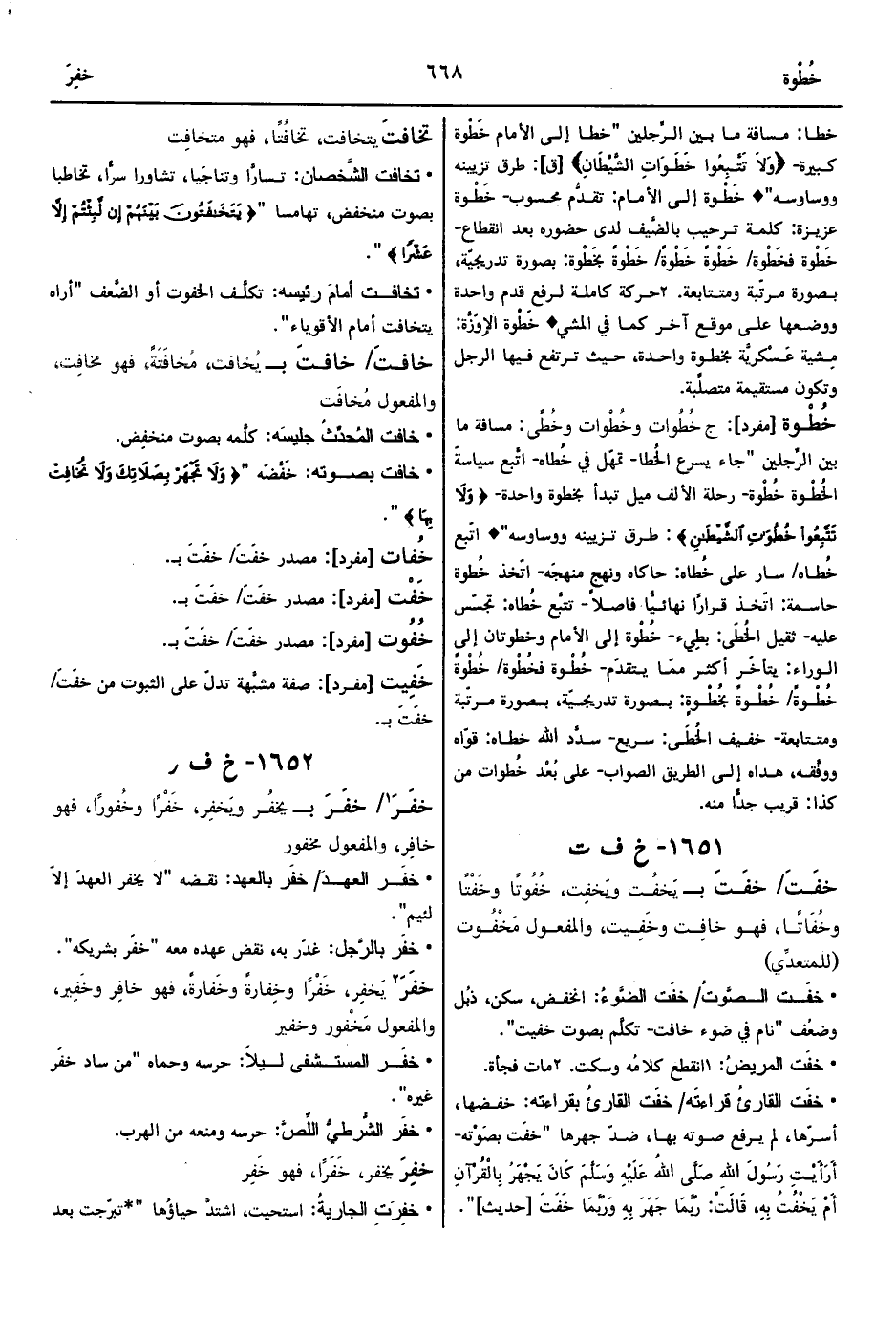 خُطْوة [مفرد]: ج خُطُوات وخُطْوات وخُطًى: مسافة ما بين الرِّجلين "جاء يسرع الخُطا- تمهّل في خُطاه- اتَّبع سياسةَ الخُطْوة خُطْوة- رحلة الألف ميل تبدأ بخطوة واحدة- {وَلاَ تَتَّبِعُوا خُطُوَاتِ الشَّيْطَانِ}: طرق تزيينه ووساوسه" ° اتّبع خُطاه/ سار على خُطاه: حاكاه ونهج منهجَه- اتّخذ خُطوة حاسمة: اتّخذ قرارًا نهائيًّا فاصلاً- تتبَّع خُطاه: تجسّس عليه- ثقيل الخُطَى: بطِيء- خُطْوة إلى الأمام وخطوتان إلى الوراء: يتأخّر أكثر ممّا يتقدّم- خُطْوة فخُطْوة/ خُطْوةً خُطْوةً/ خُطْوةً بخُطْوةٍ: بصورة تدريجيّة، بصورة مرتّبة ومتتابعة- خفيف الخُطَى: سريع- سدَّد الله خطاه: قوّاه ووفَّقه، هداه إلى الطريق الصواب- على بُعْد خُطوات من كذا: قريب جدًّا منه.