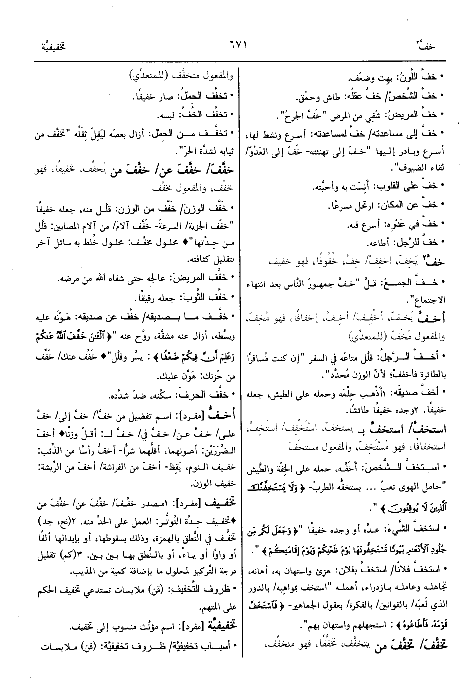 • خفَّف ما بصديقه/ خفَّف عن صديقه: هَوّنَه عليه وبسَّطه، أزال عنه مشقَّة، روَّح عنه " {الآنَ خَفَّفَ اللهُ عَنْكُمْ وَعَلِمَ أَنَّ فِيكُمْ ضَعْفًا}: يسَّر وقلَّل"? خَفِّف عنك/ خَفِّف من حُزنك: هَوِّن عليك.
