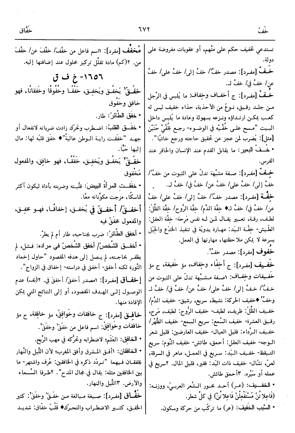 1 - صفة مشبَّهة تدلّ على الثبوت من خفَّ1/ خفَّ إلى/ خفَّ على/ خفَّ عن/ خفَّ في/ خفَّ لـ وخفَّ2 ° خفيف الحركة: نشيط، سريع، رشيق- خفيف الدَّم/ خفيف الظِّلّ: ظريف، لطيف- خفيف الرُّوح: لطيف، مَرِح، رقيق العشرة- خفيف السَّمع: سريع السمع- خفيف الظَّهْر/ خفيف الرِّداء: قليل العيال- خفيف العارضين: قليل شعر الوجه- خفيف العقل: أحمق، طائش- خفيف النَّوم: سريع التيقظ- خفيف اليَد: سريع في العمل، ماهر في السرقة، لصّ، نشّال- خفيف ذات اليَد: فقير، قليل المال.