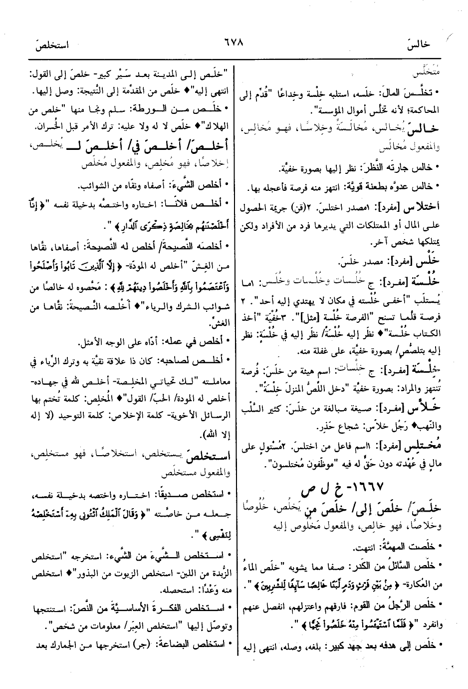 • أخلص فلانًا: اختاره واختصَّه بدخيلة نفسه " {إِنَّا أَخْلَصْنَاهُمْ بِخَالِصَةٍ ذِكْرَى الدَّارِ} ".